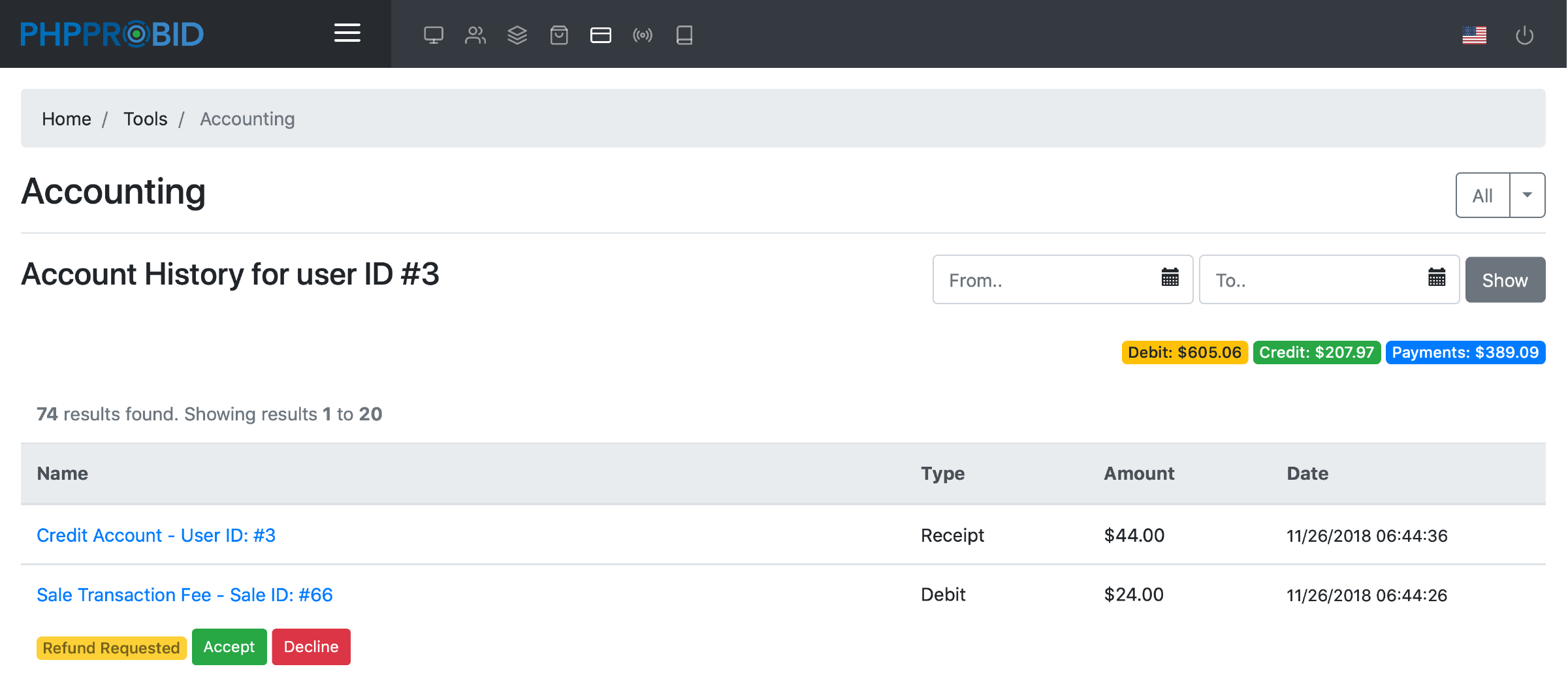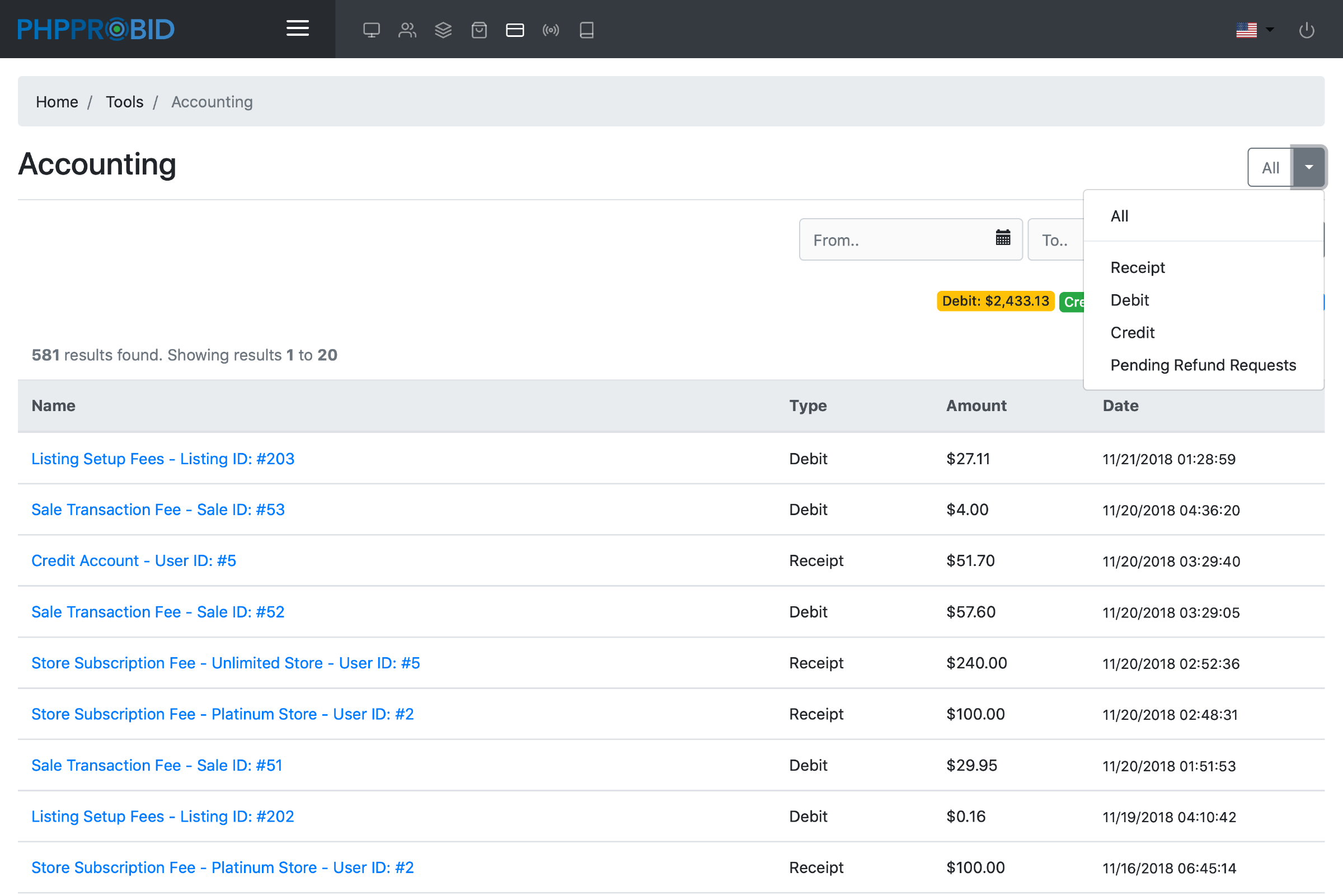 Keep track of site transactions (listing & transaction fees) from the Accounting menu (Admin Control Panel -> Tools -> Accounting).