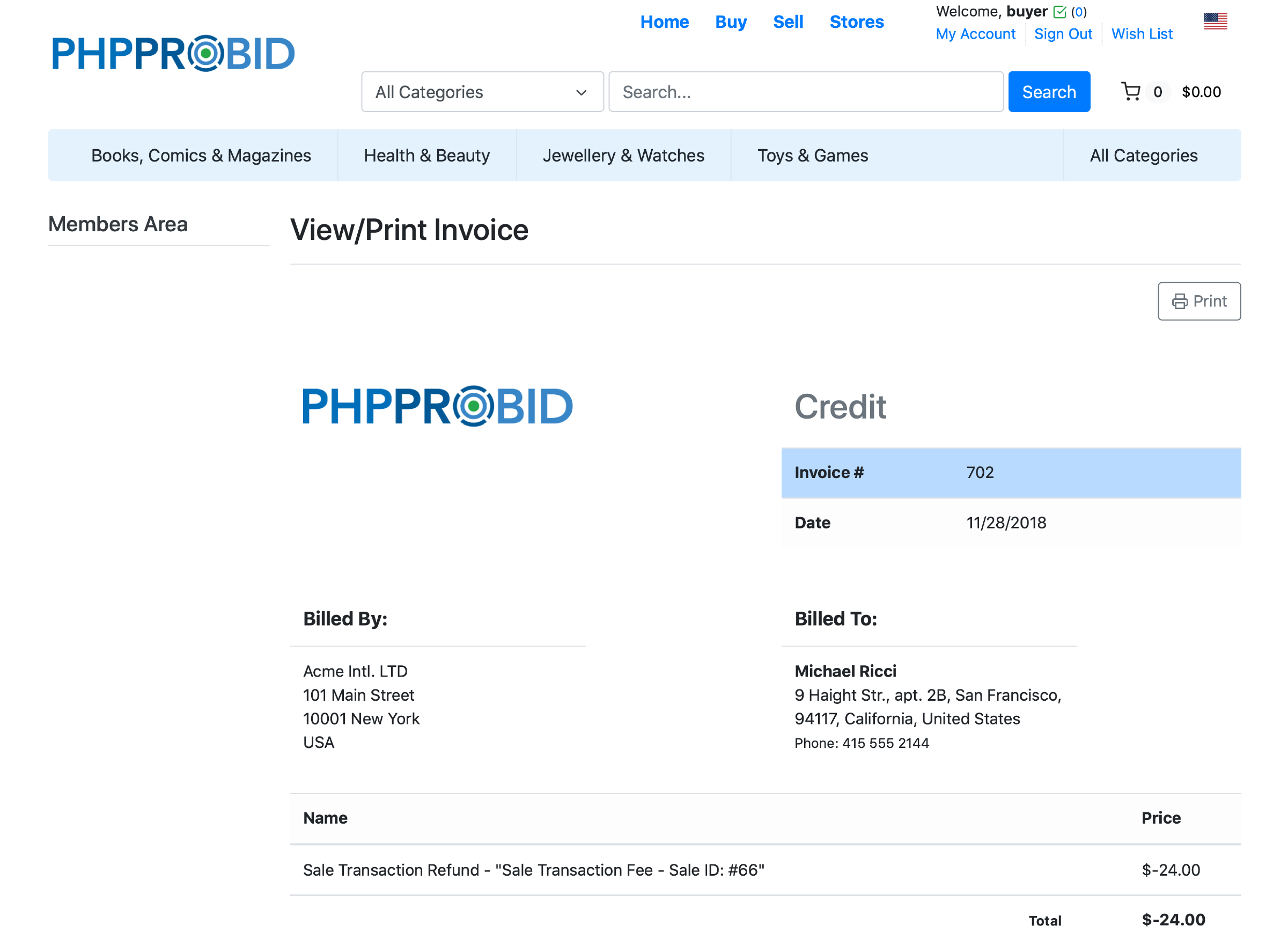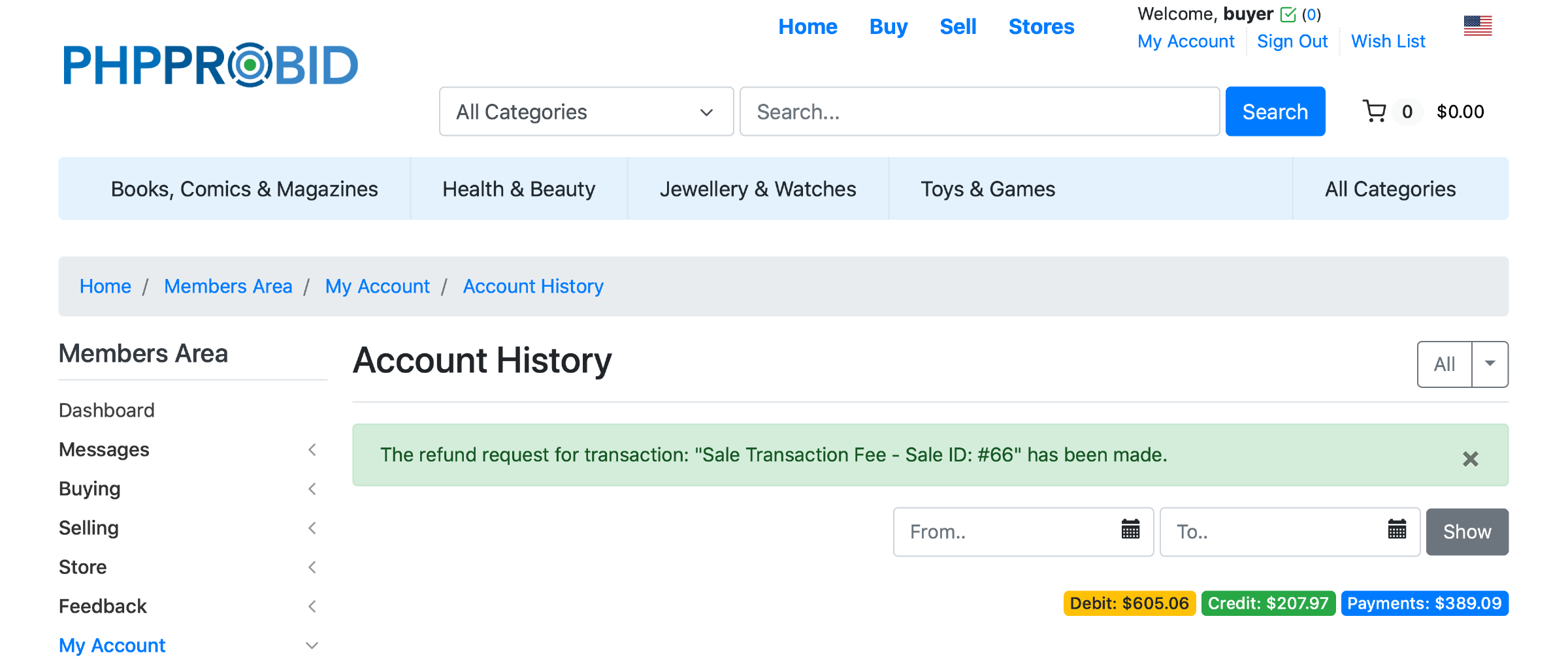 Select from the Account History (Home -> Members Area -> My Account -> Account History) a Sale Transaction Fee and click on Request Refund: