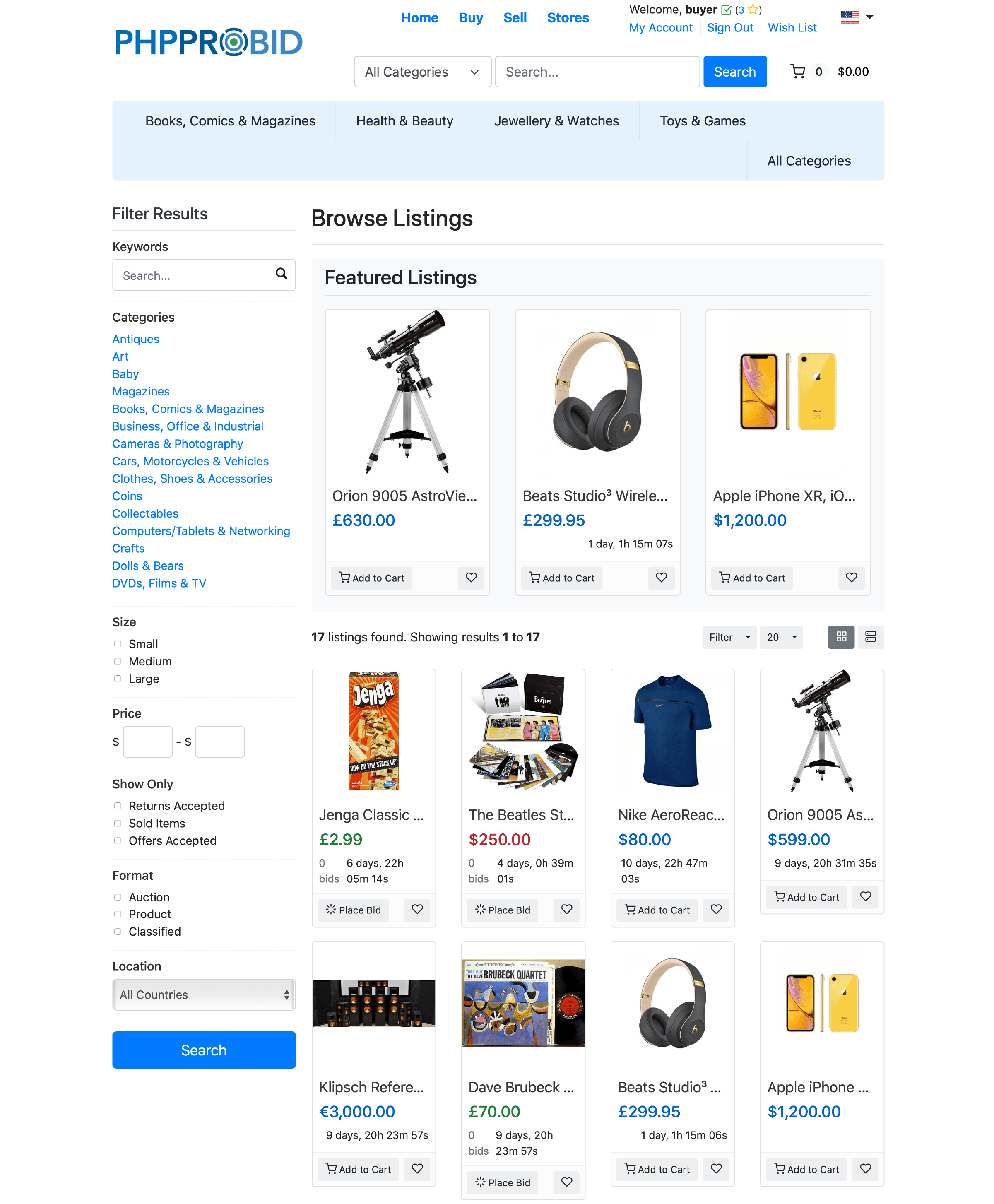 Click Search in the store header and you'll be displayed a page with all current open products (both for sale and for auction):