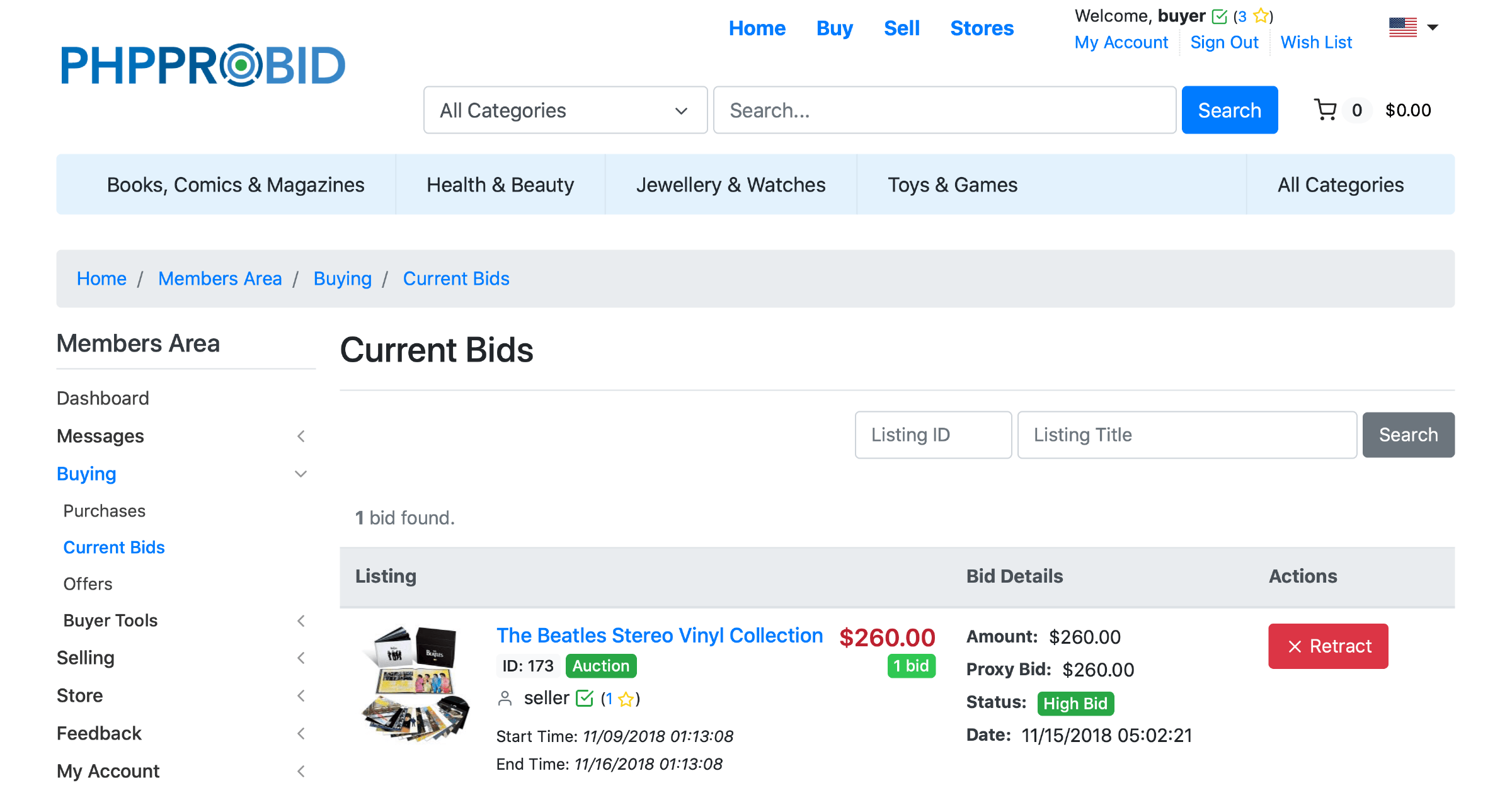 See the status of a bid or retract a bid from the Current Bids (Home -> Members Area -> Buying -> Current Bids) menu: