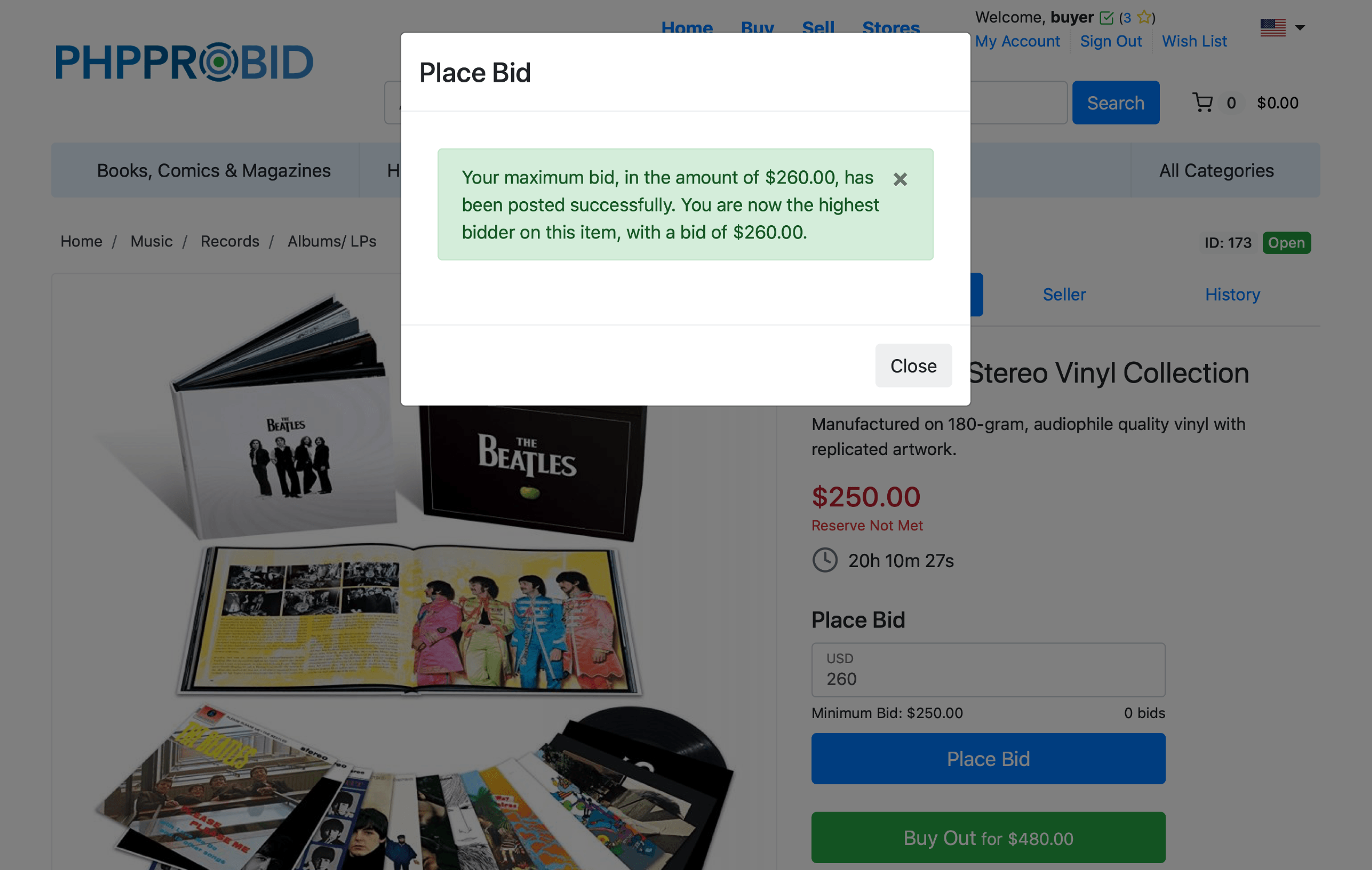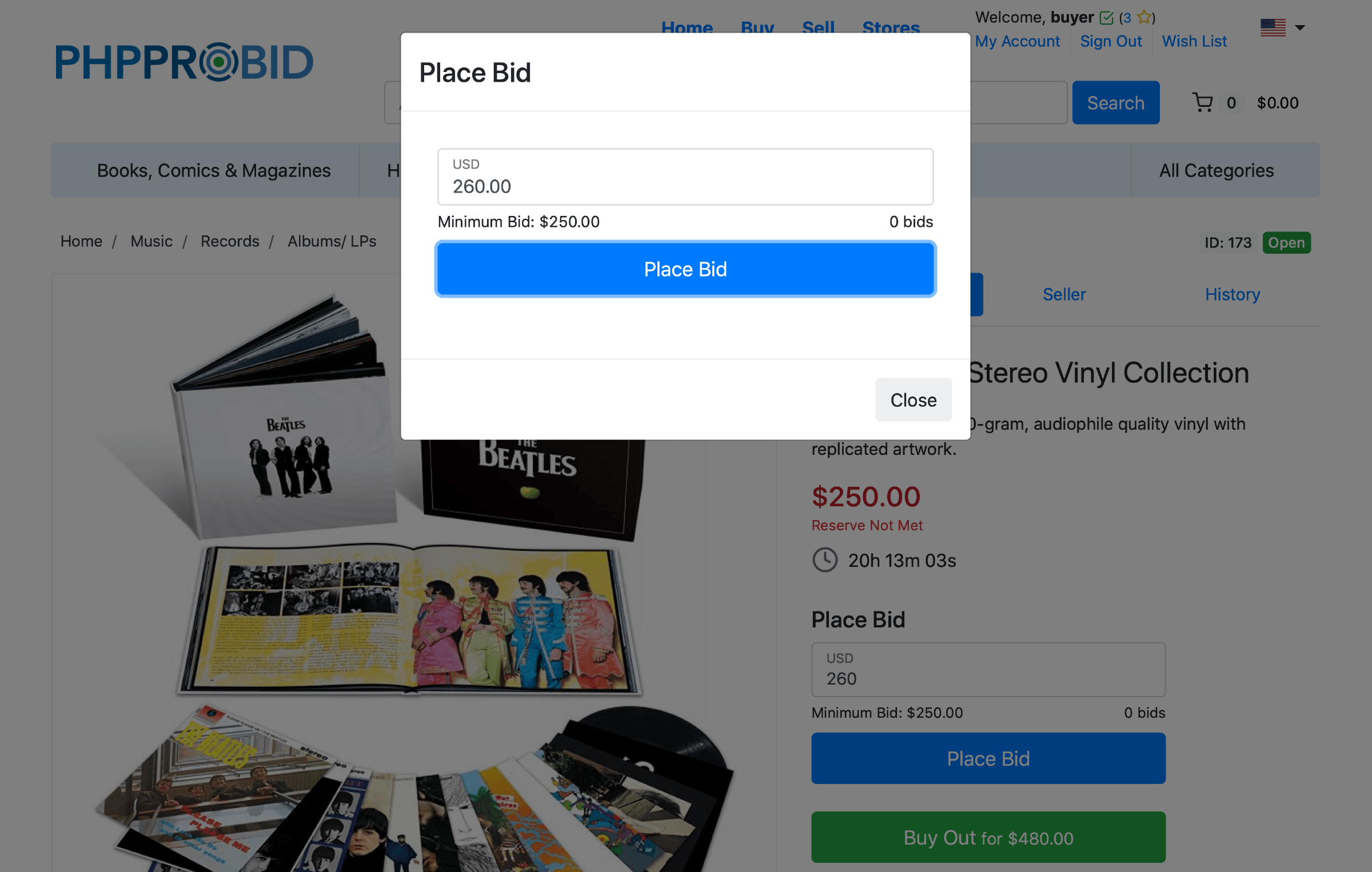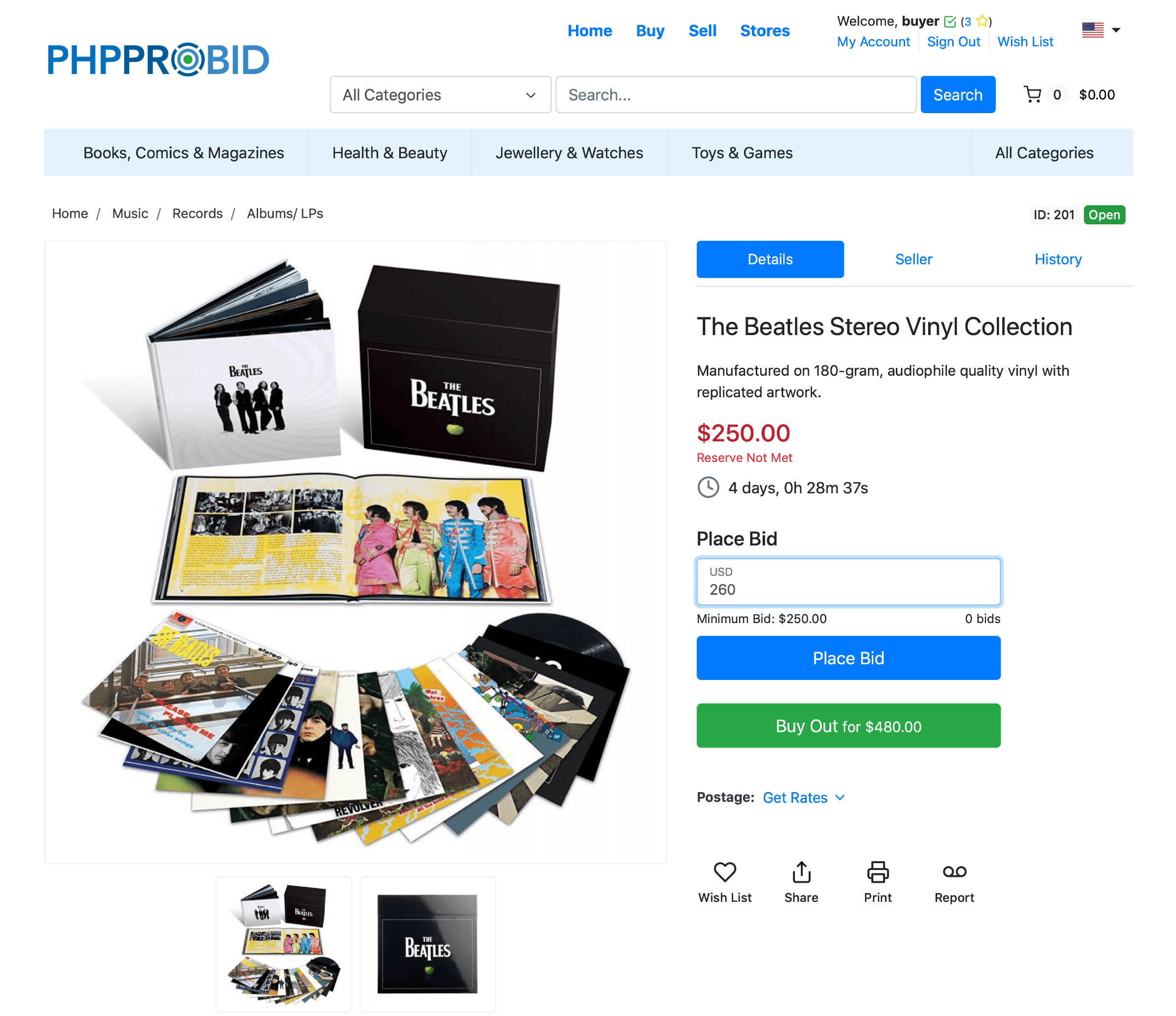 The Auction page will display the current highest bid, number of bids, minimum bid accepted and whether the Reserve Price (if set) has been met.