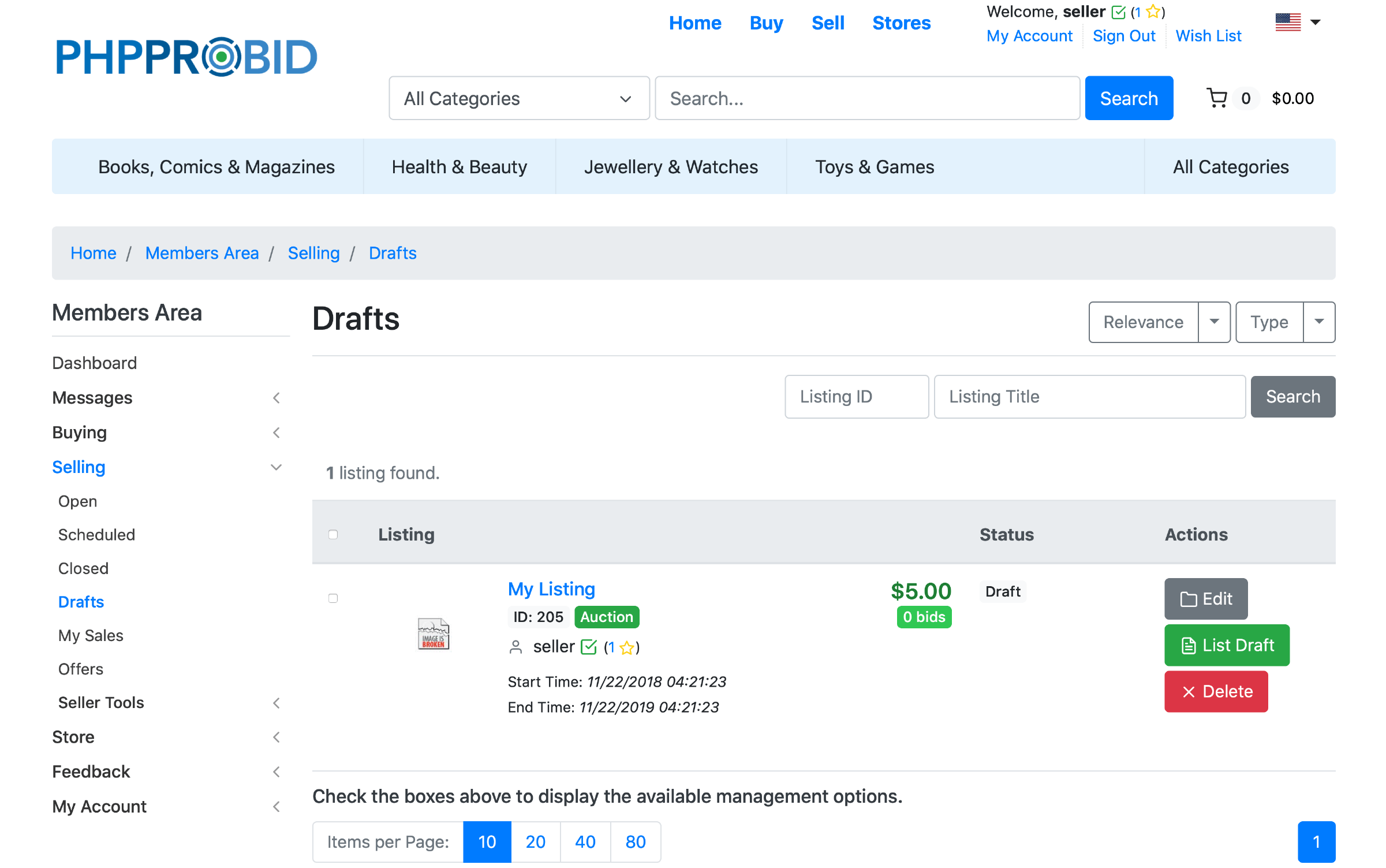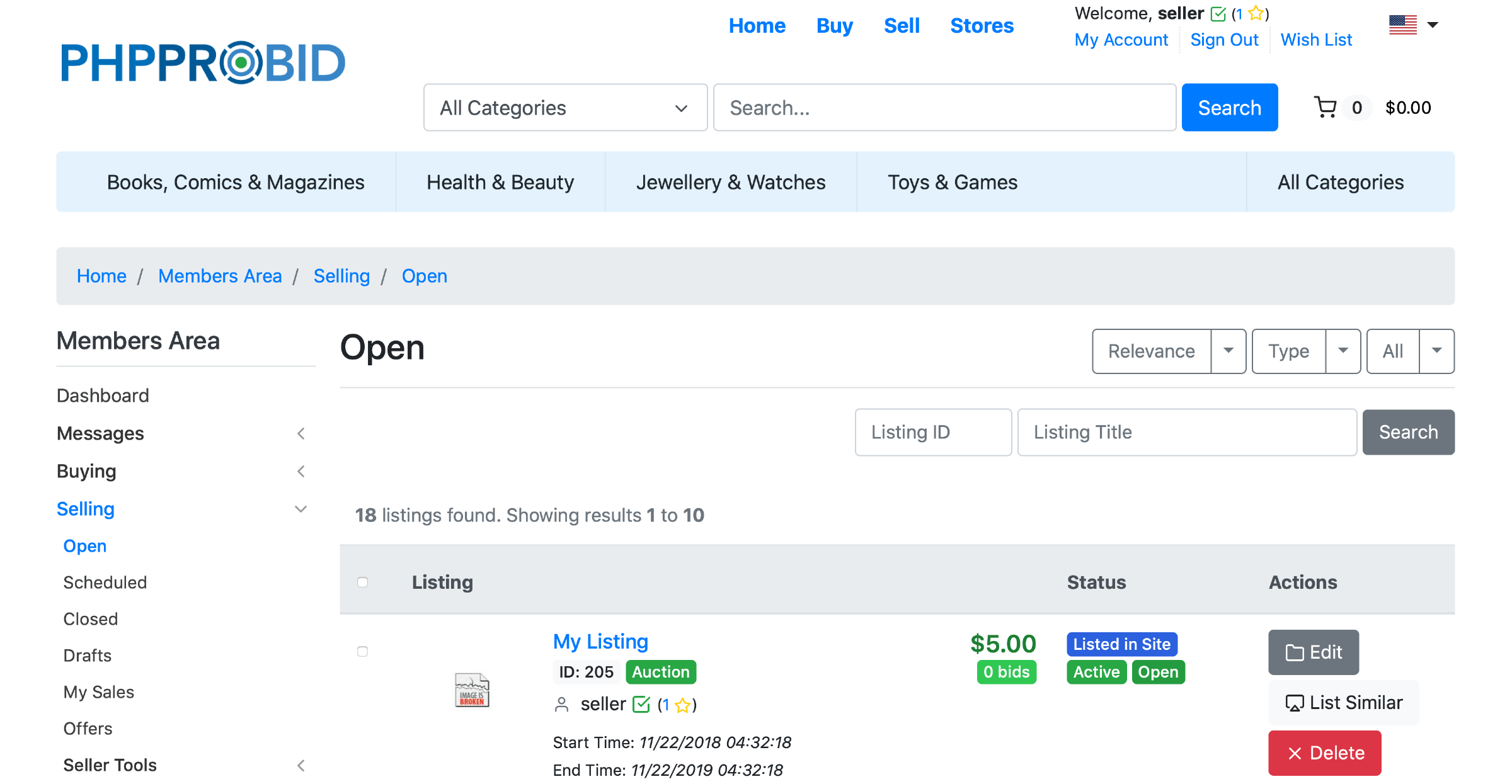 The listed item(s) will be available for viewing and editing in the Open (Home -> Members Area -> Selling -> Open) section: