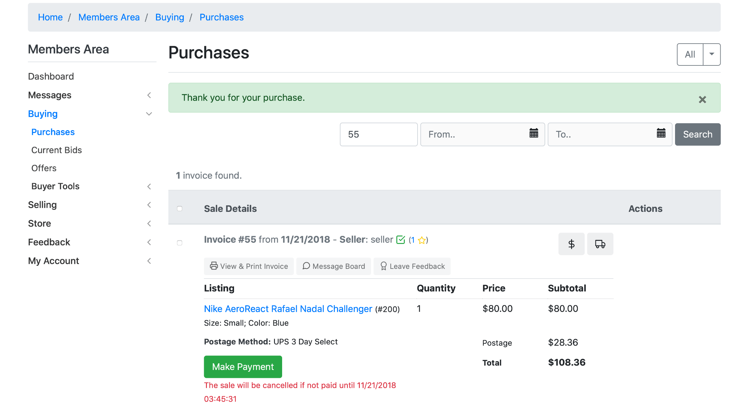 Note: Clients can also pay from the Purchases (Home -> Members Area -> Buying -> Purchases) menu by selecting Make Payment: