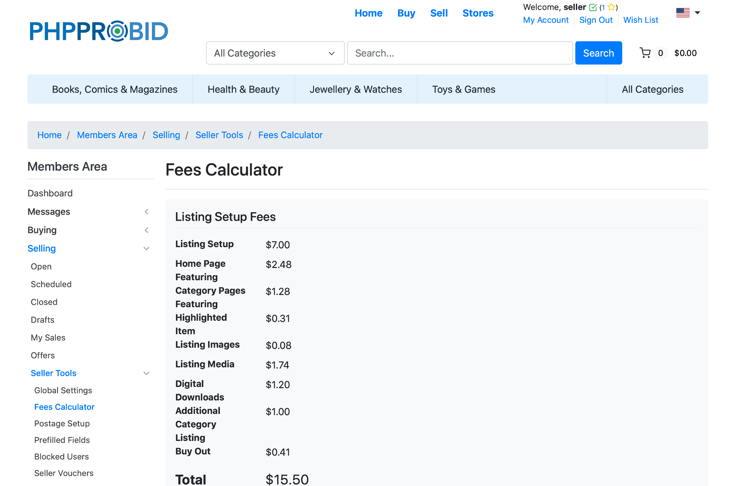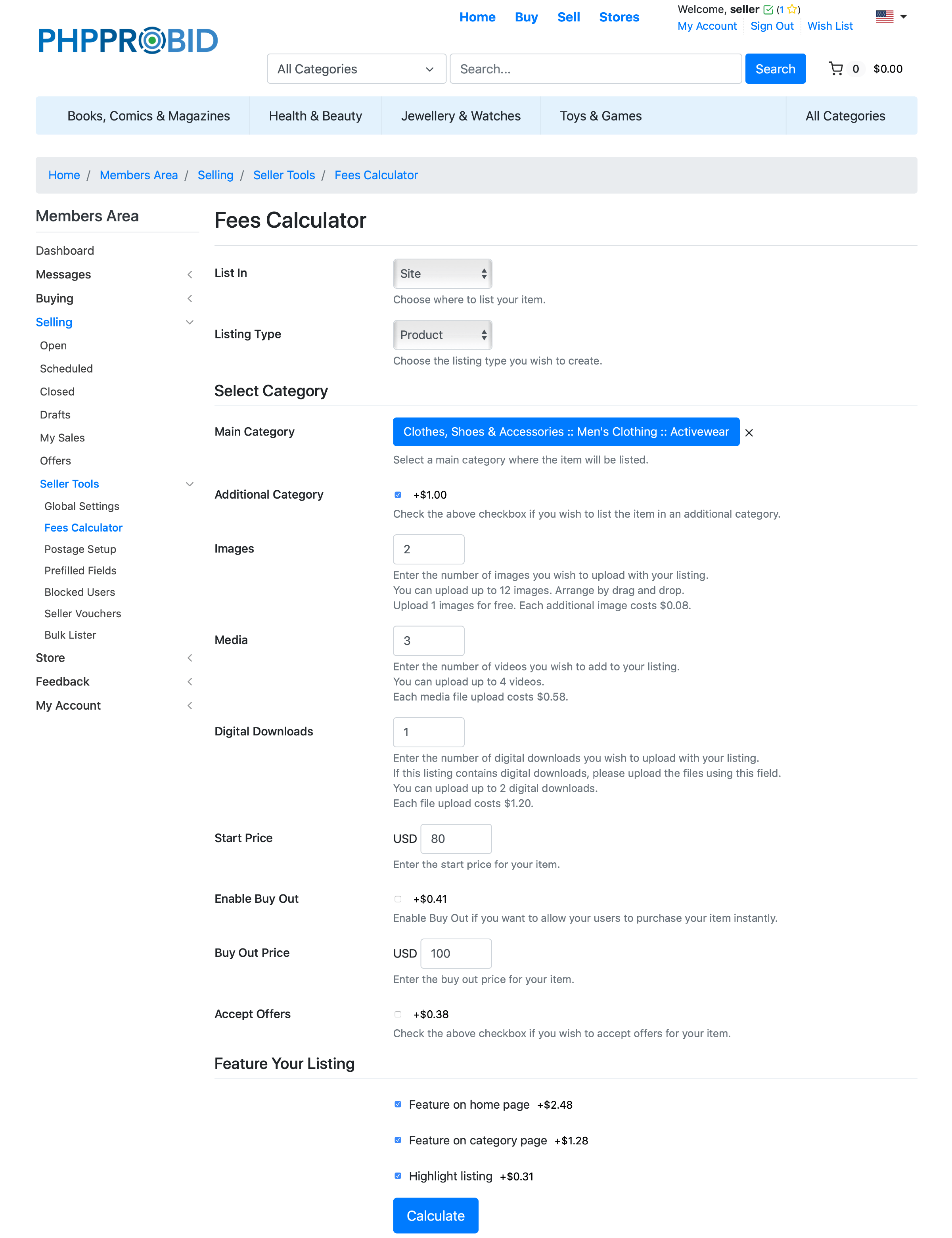 Select additional features and listings options from the Fees Calculator (Home -> Members Area -> Selling -> Seller Tools -> Fees Calculator) menu and click Calculate: