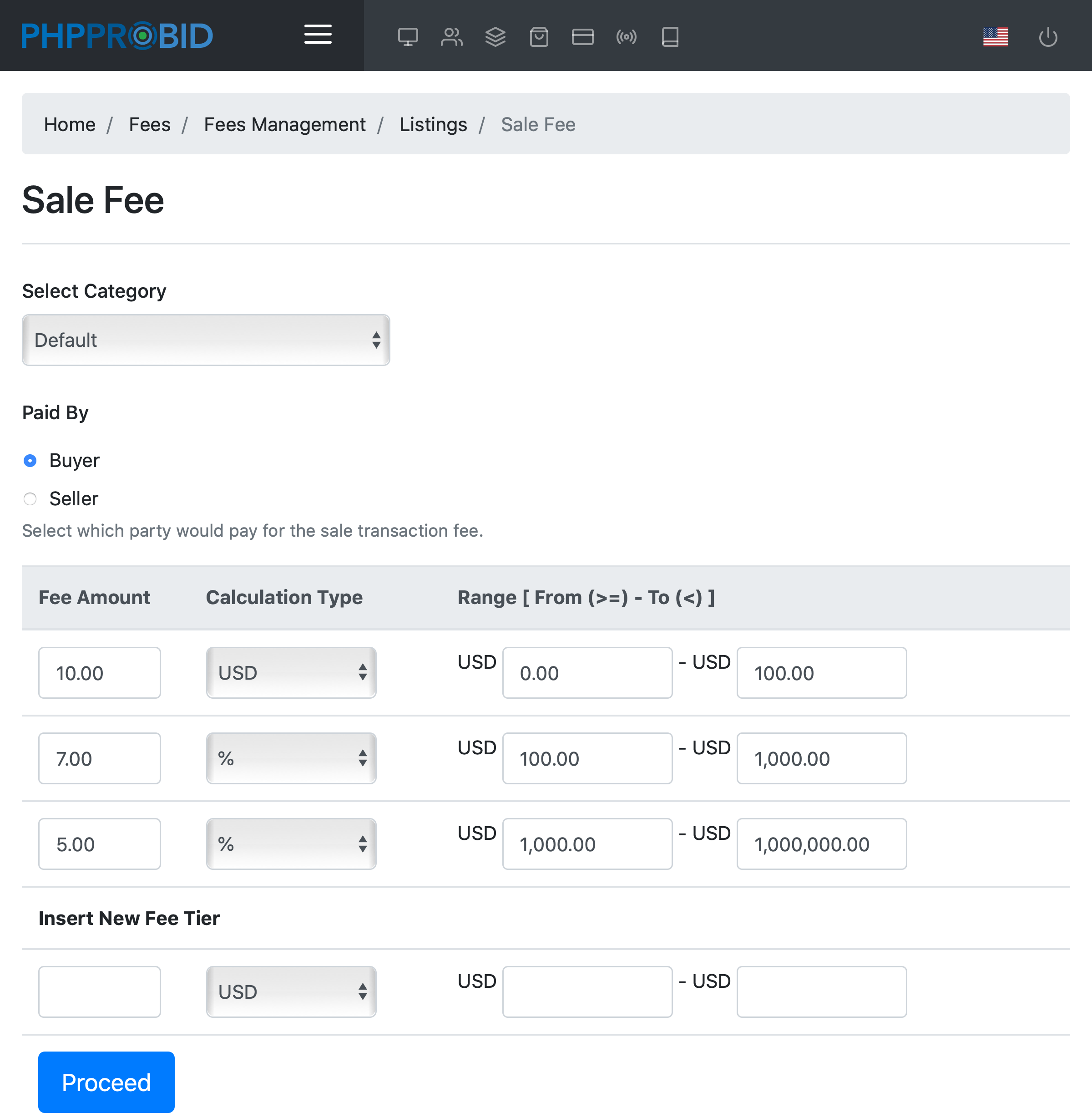 Note: The admin selects who pays the fee: seller or buyer.