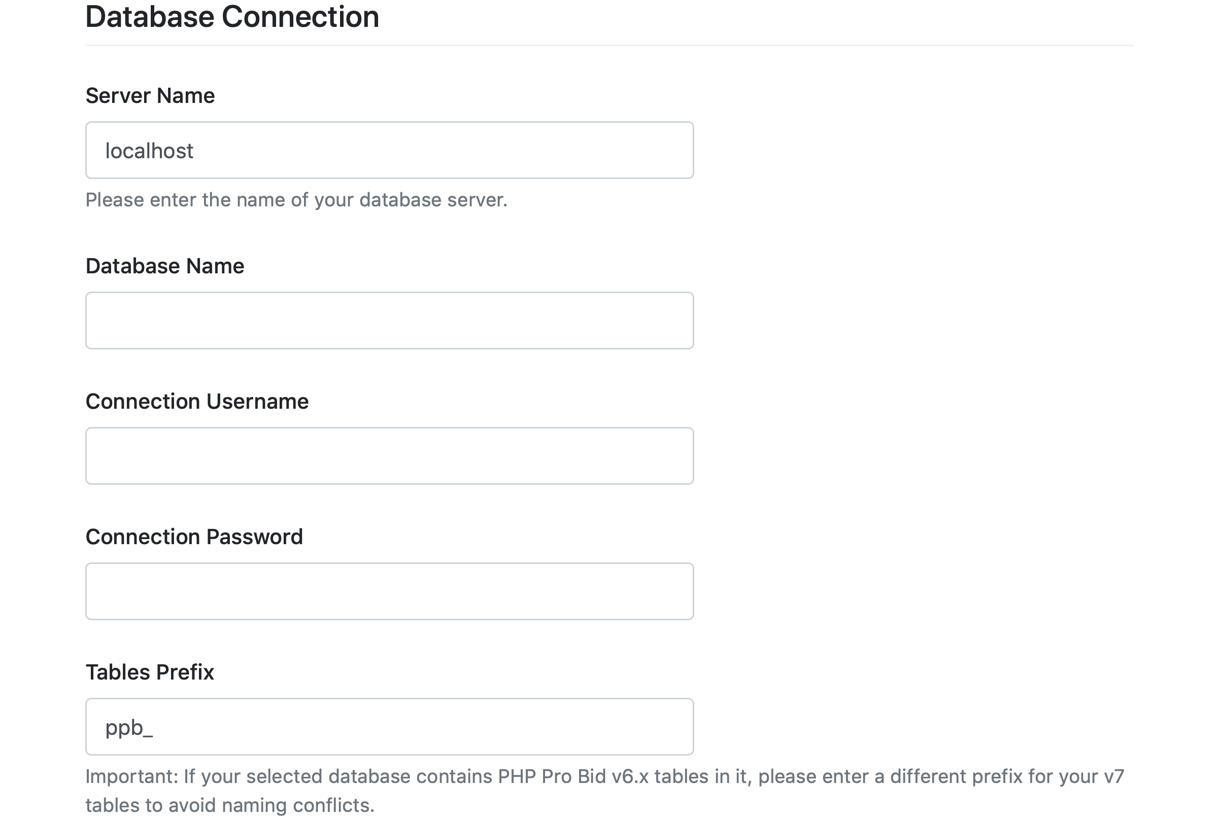 Important: If the selected database contains PHP Pro Bid v6.x tables, please enter a different prefix for the v7 tables to avoid naming conflicts.
