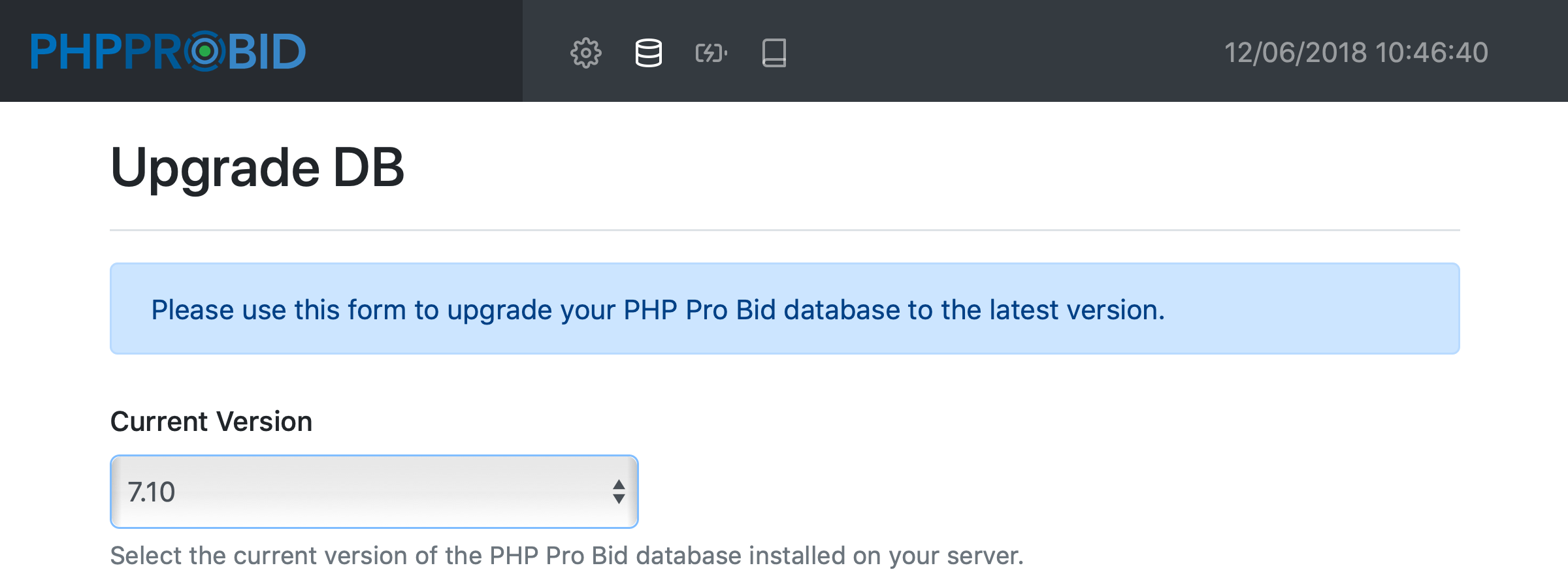 www.yoursite.com/install/upgrade) and you'll see the following sections. Please complete them:Select the current version of the PHP Pro Bid database installed on the server.