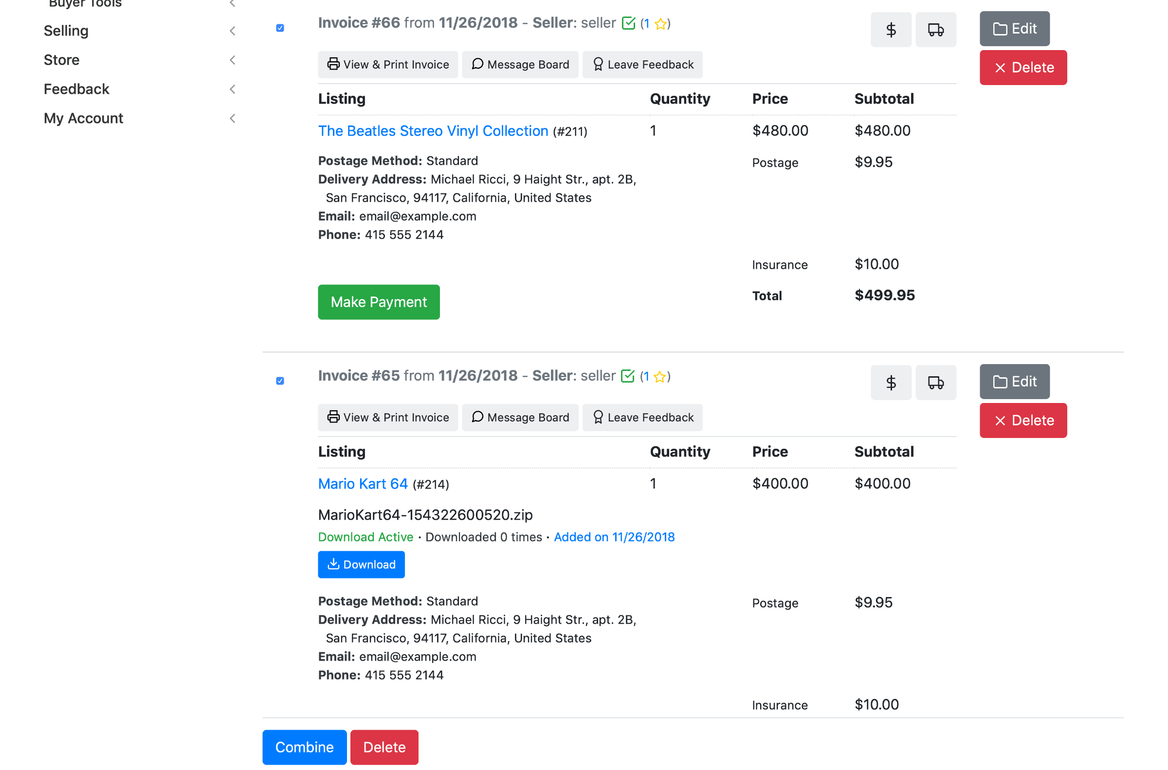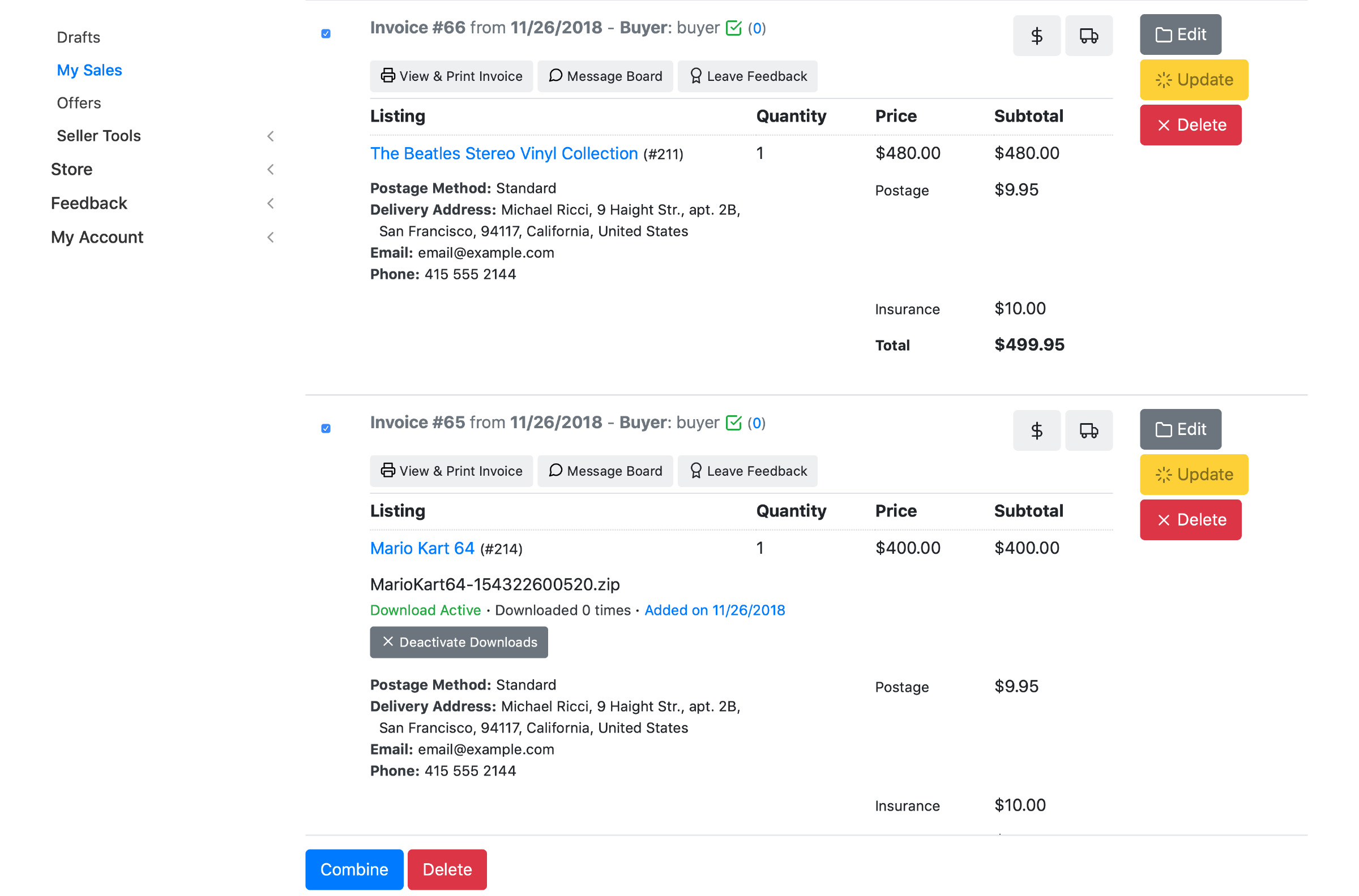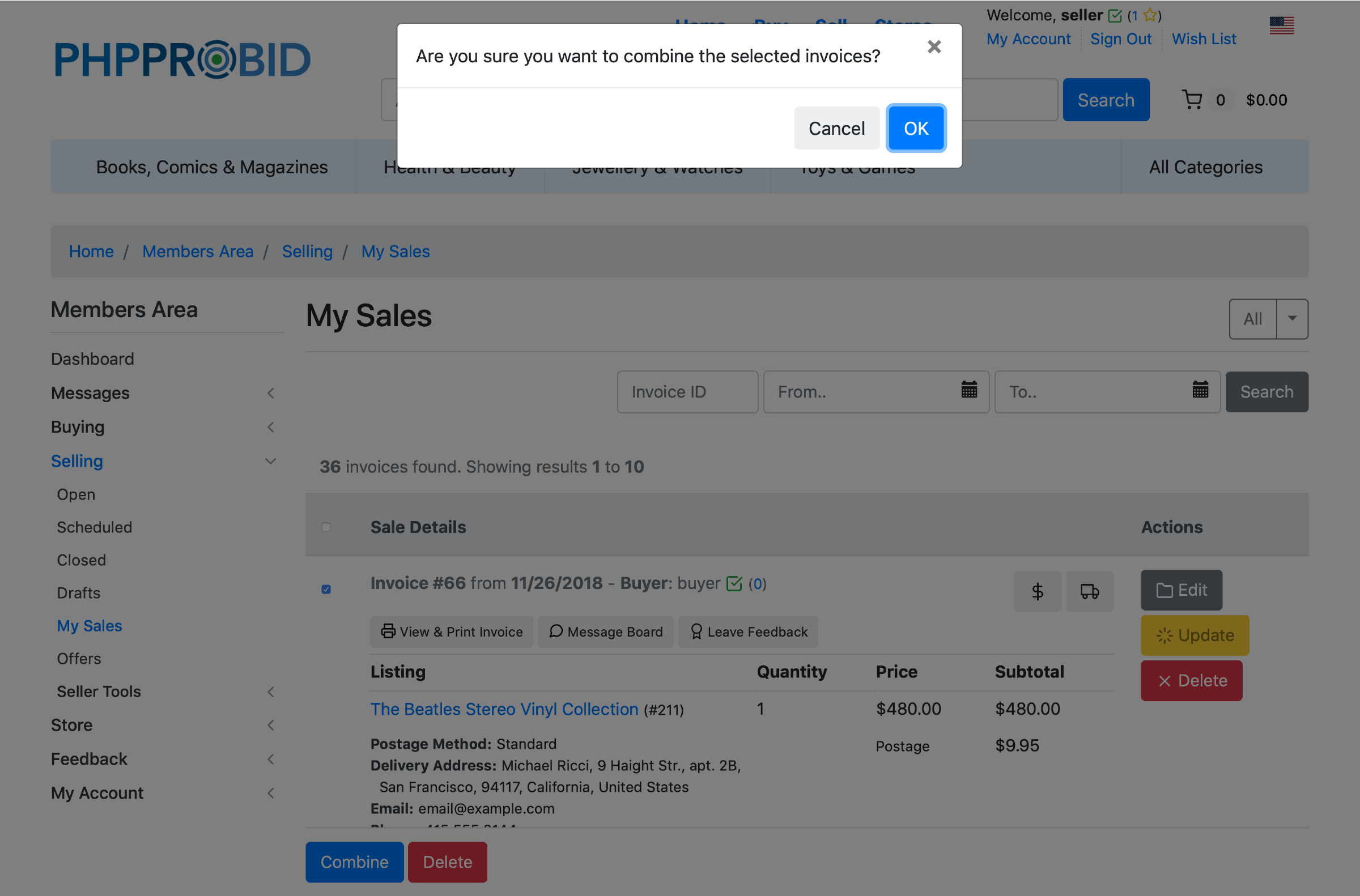 From the My Sales menu (Home -> Members Area -> Selling -> My Sales), select two (or more) invoices and click Combine: