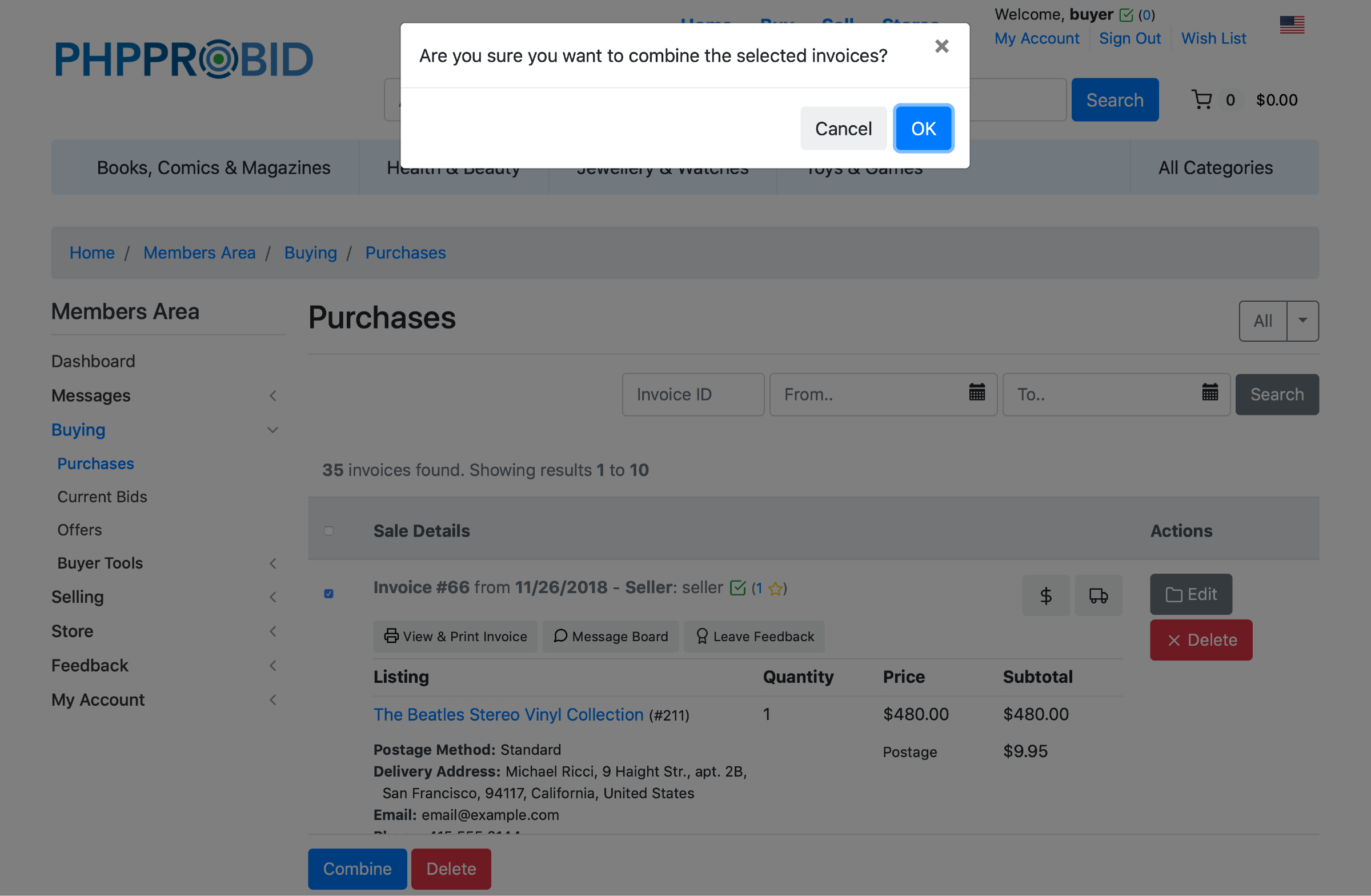 From the Purchases menu (Home -> Members Area -> Buying -> Purchases) select two or more invoices and click Combine