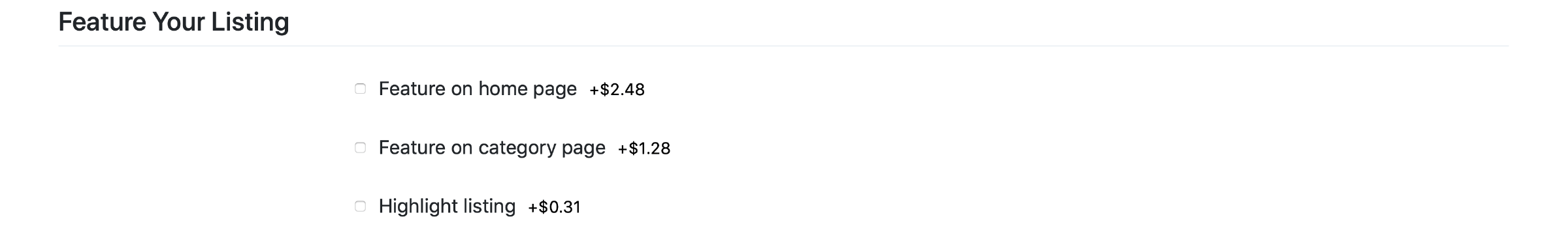 To increase the visibility of a listing, from the Feature your Listing section, select additional (paid) features: