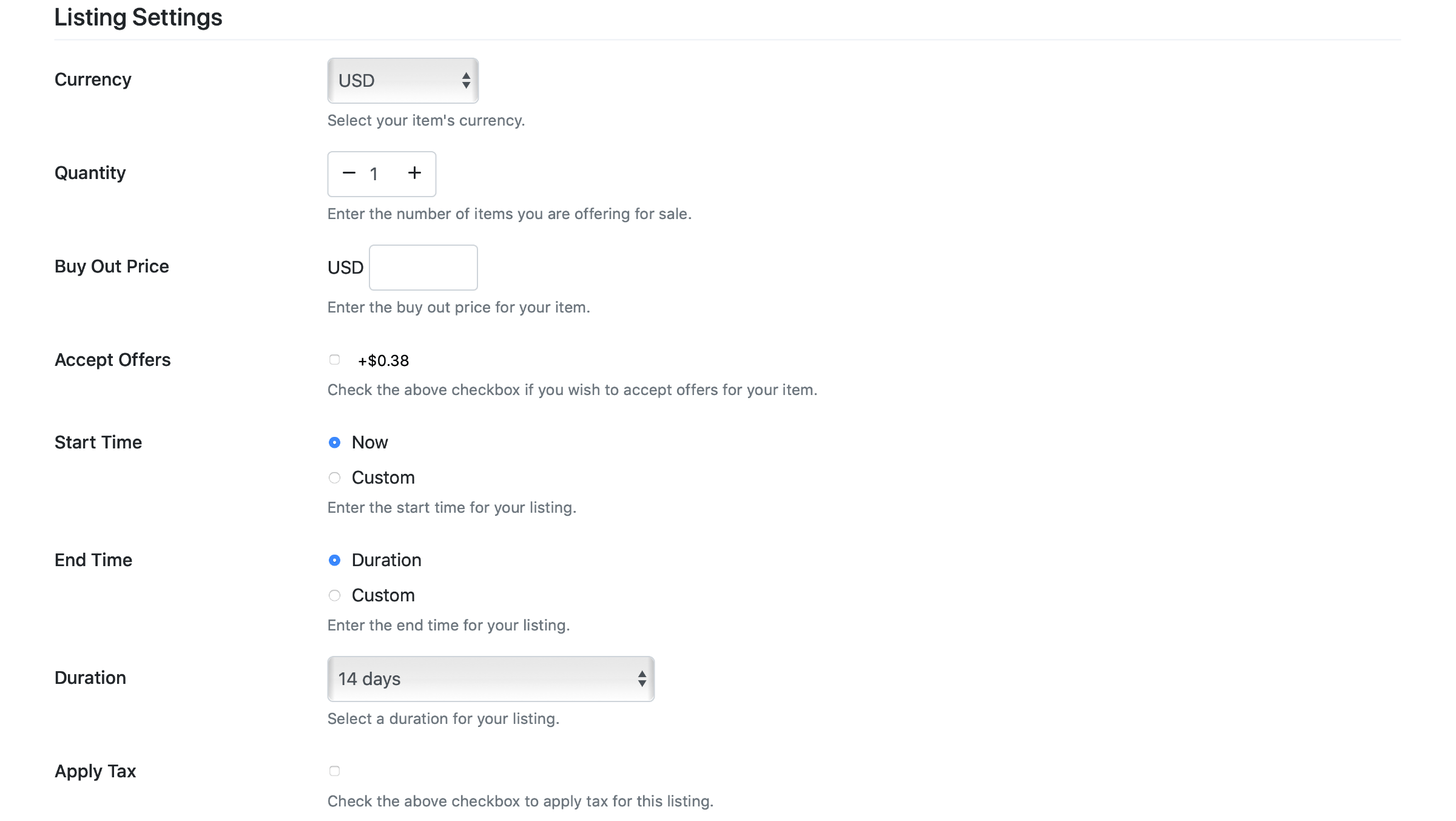 The standard listing setup process. Contains 4 required steps: details, settings, shipping and preview.
