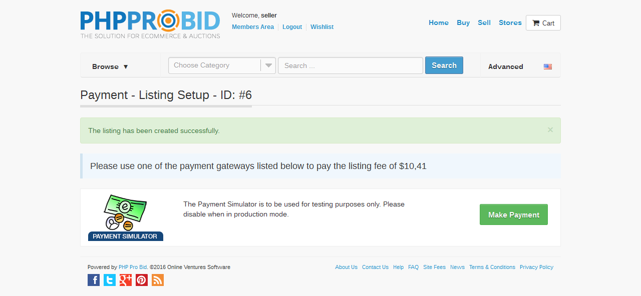 Alternatively, if the account is running in Live (Pay as you go) mode, the payment screen will display the required amount for activating the listing.