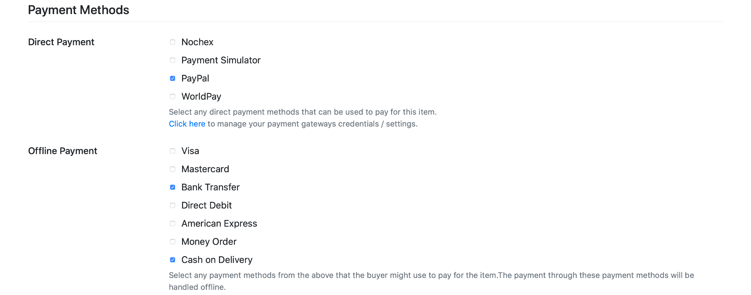 Select from the Payment Methods section the accepted: