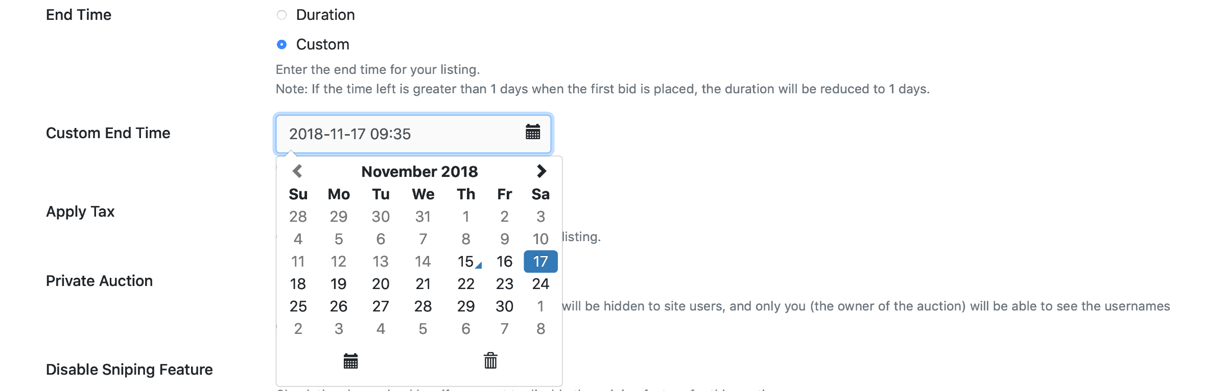 If checked, enables the custom end time option for listings.