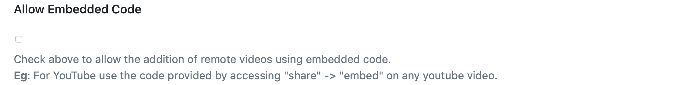 If checked, allows the upload of videos using an embedded code.