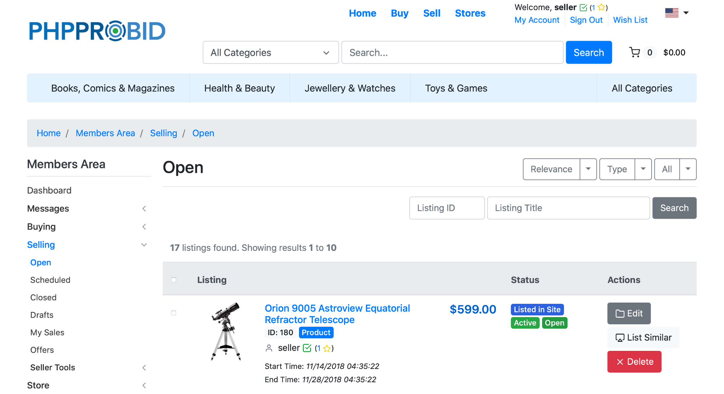 Find a listing in the Selling (Home -> Members Area -> Selling -> Open) menu: