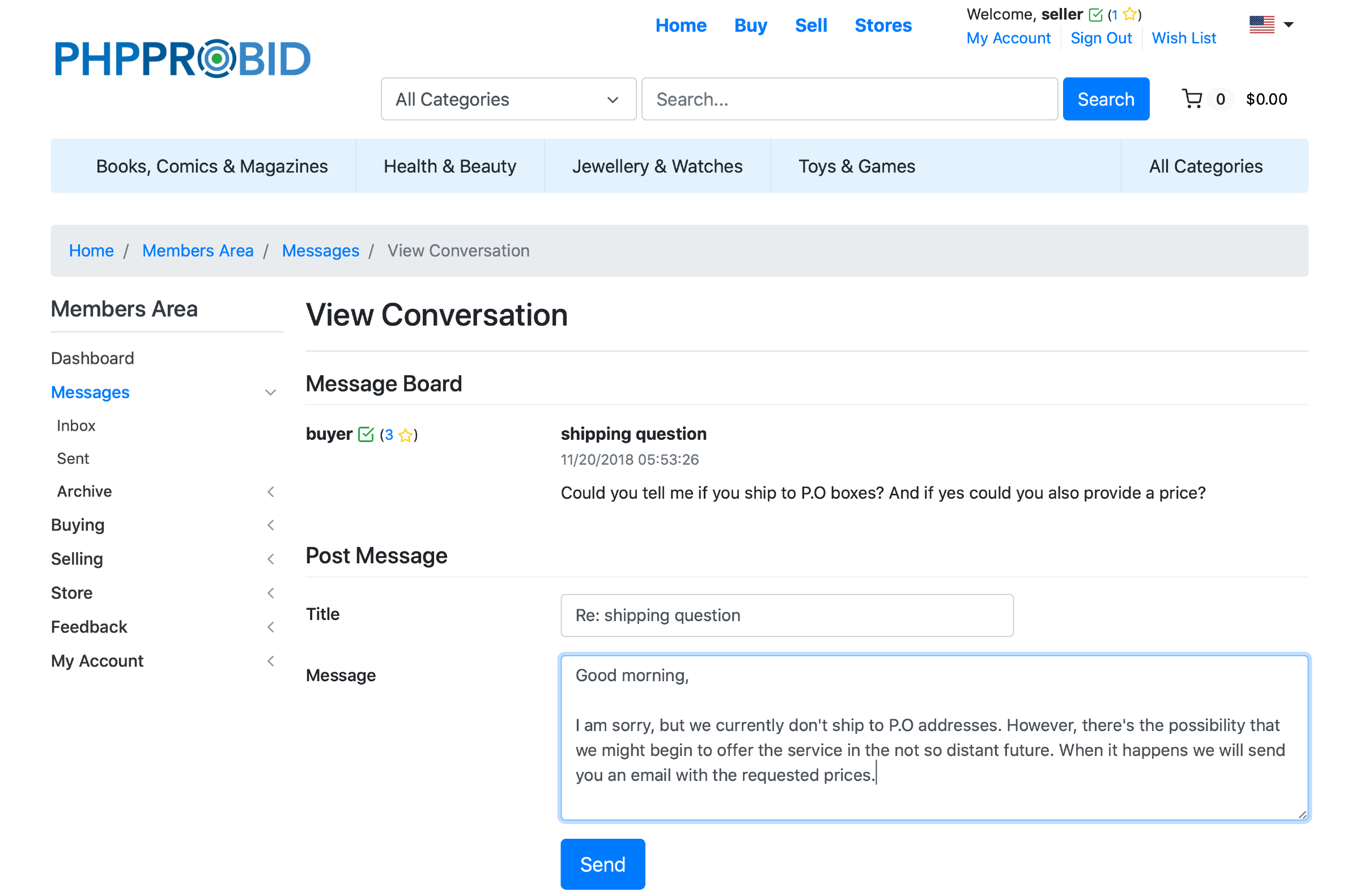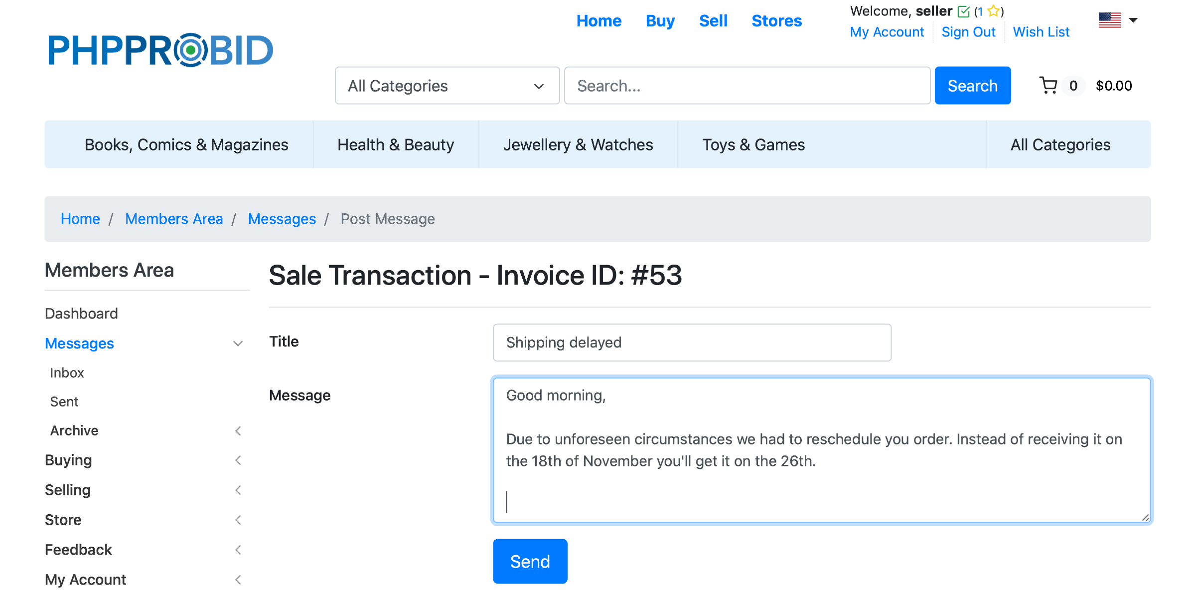 Even after completing a transaction sellers (or buyers) can send updates or follow-up questions from the My Sales (Home -> Members Area -> Selling -> My Sales) menu. Select an invoice and open Message Board: