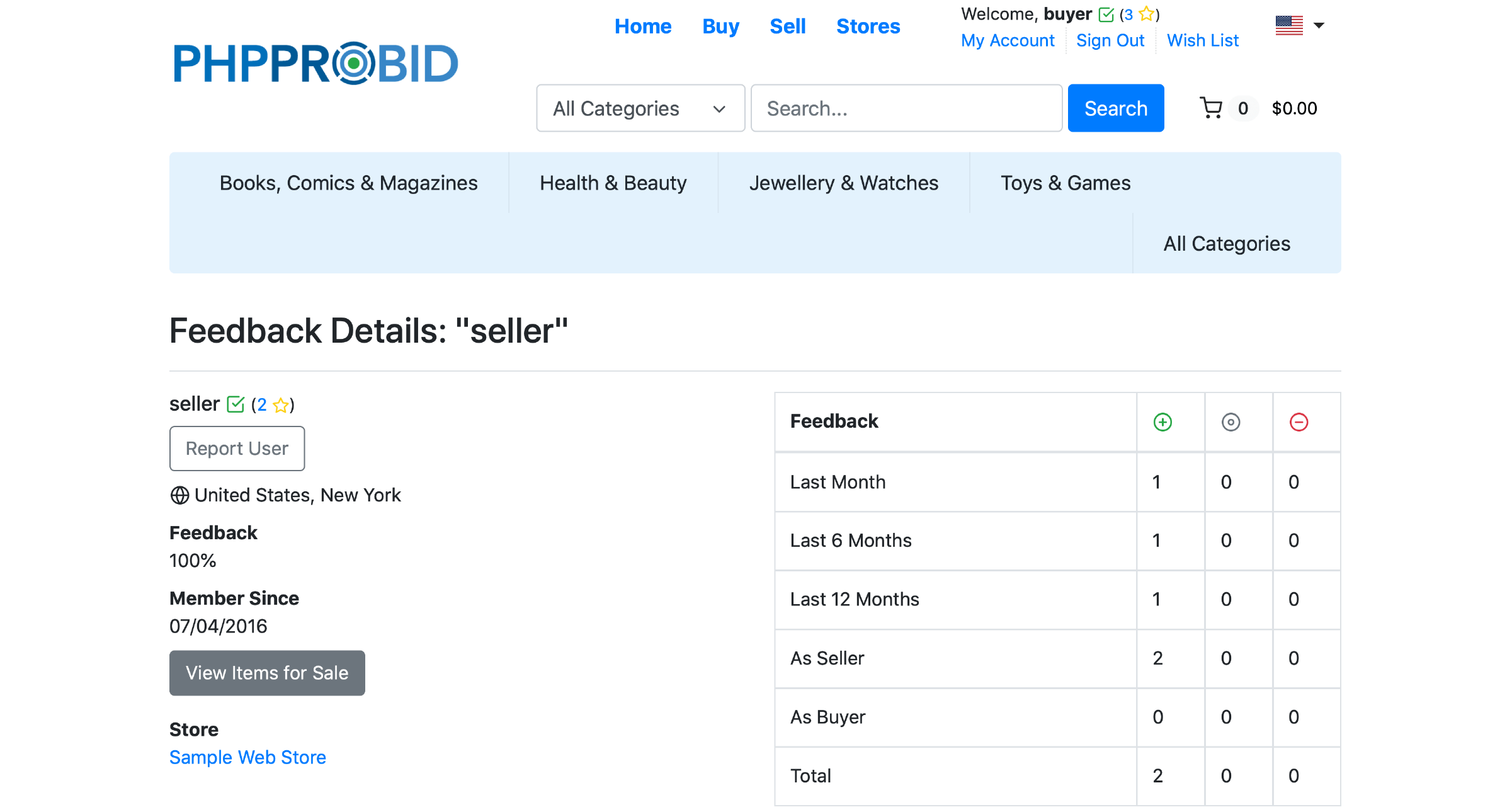 One can report users, see their location, feedback (percentage of positive ratings), type of site membership, items available for sale and access their webstores.