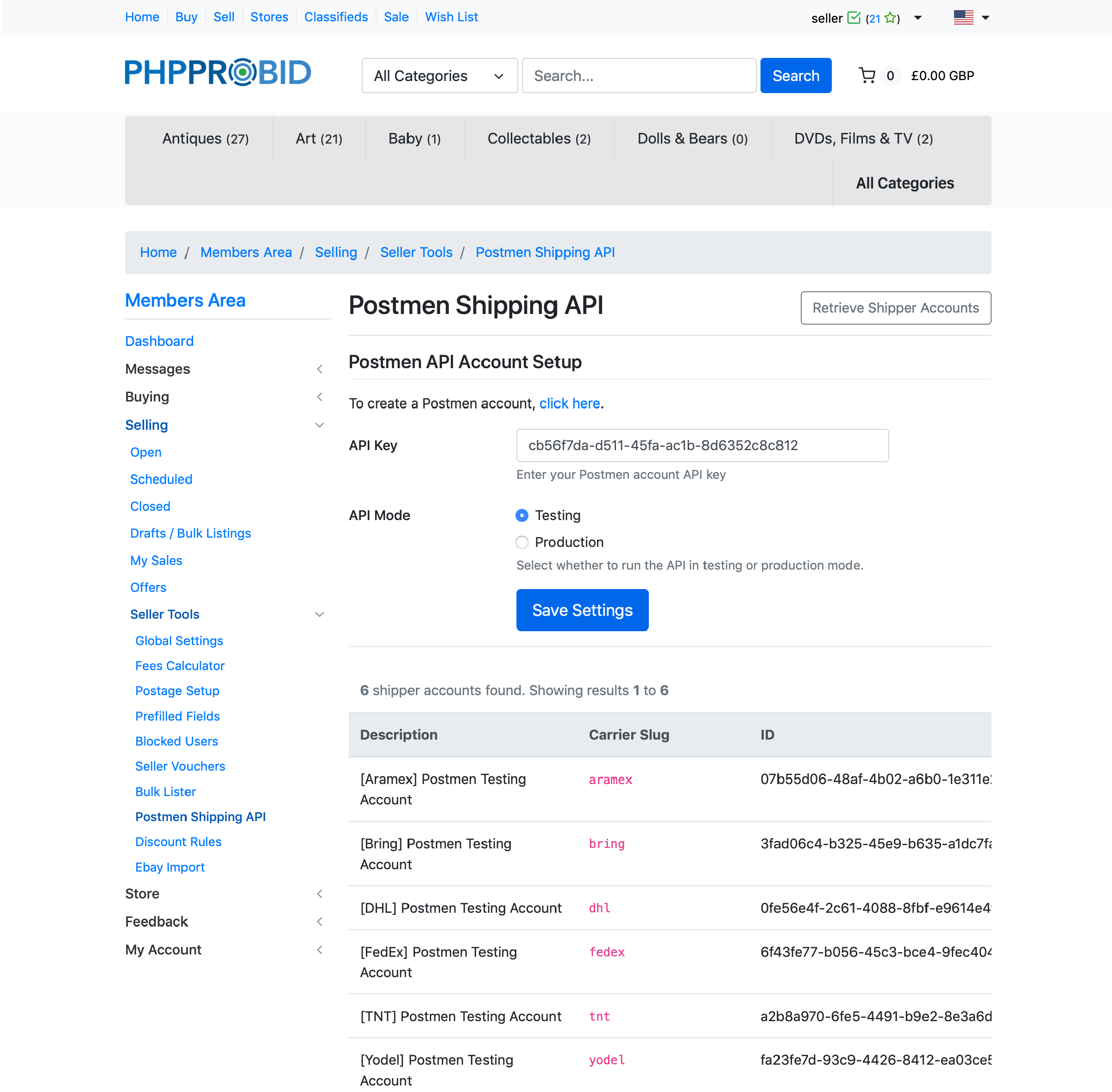 When enabled, the Postmen Shipping API will be found in the Front End (Home -> Members Area -> Selling -> Seller Tools -> Postmen Shipping API).