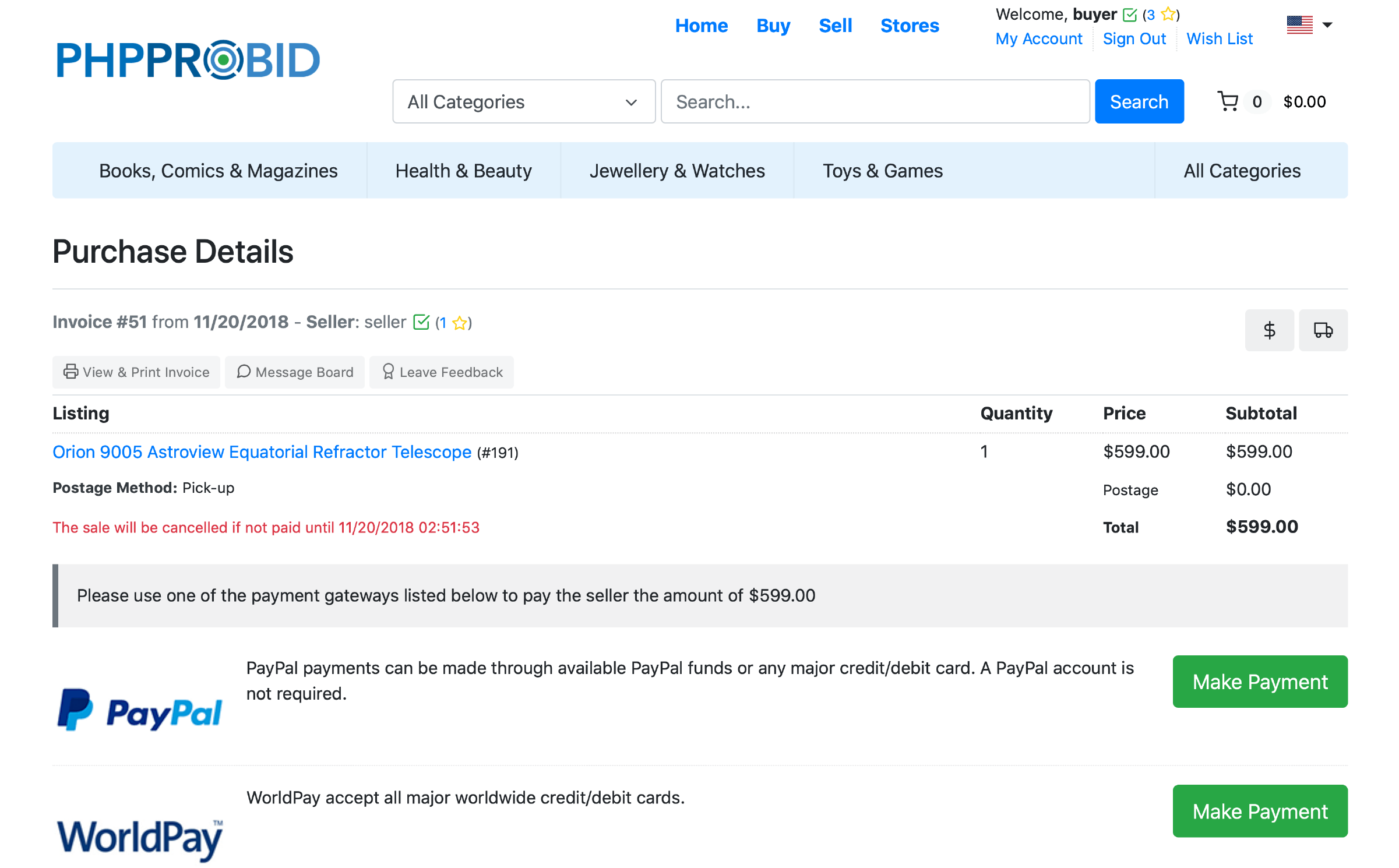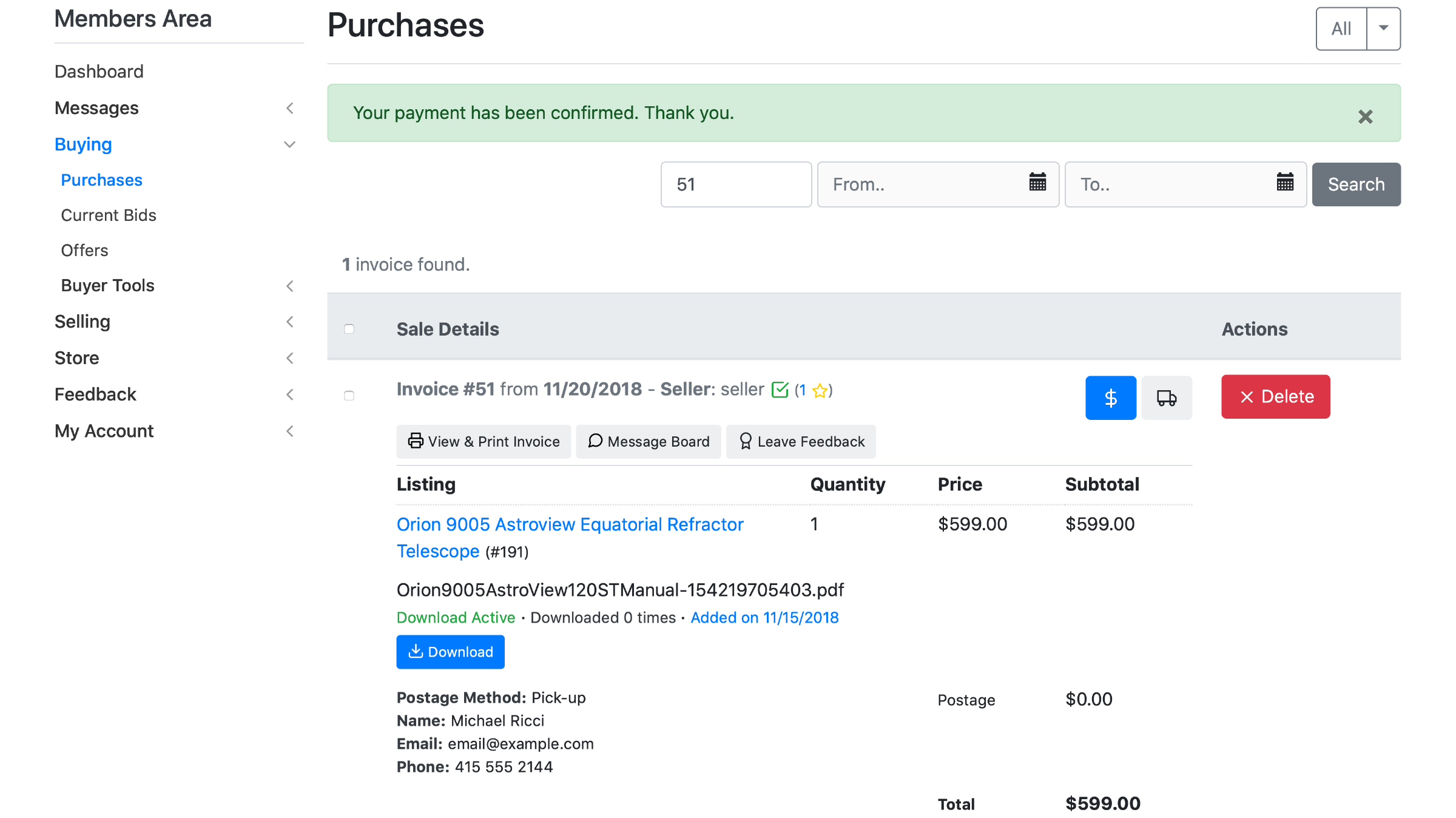 Next, you'll be directed to the Purchases (Home -> Members Area -> Buying -> Purchases) where you can see the invoice and pay it: