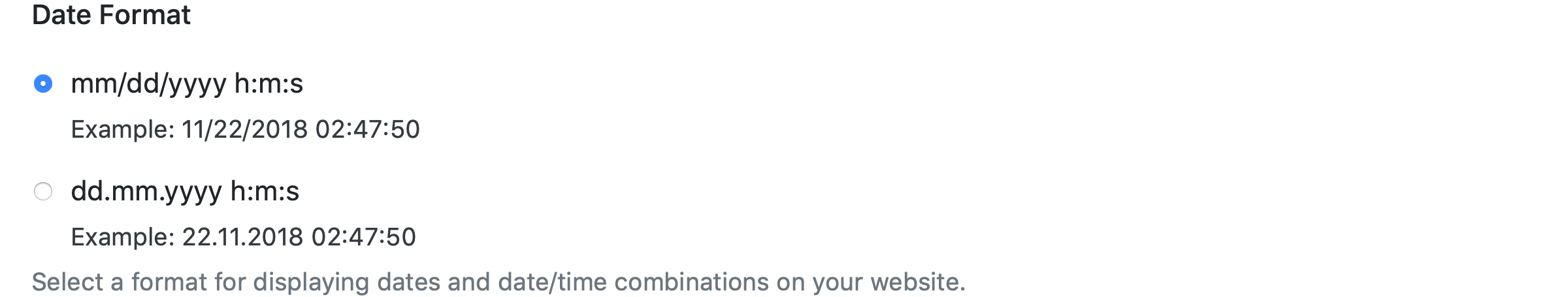 Select a format for displaying dates and date/time combinations on the website.