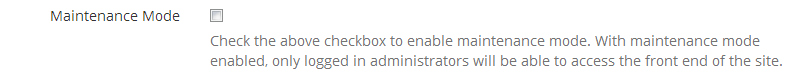If checked, enables maintenance mode. When enabled, only logged in administrators will be able to access the Front End.