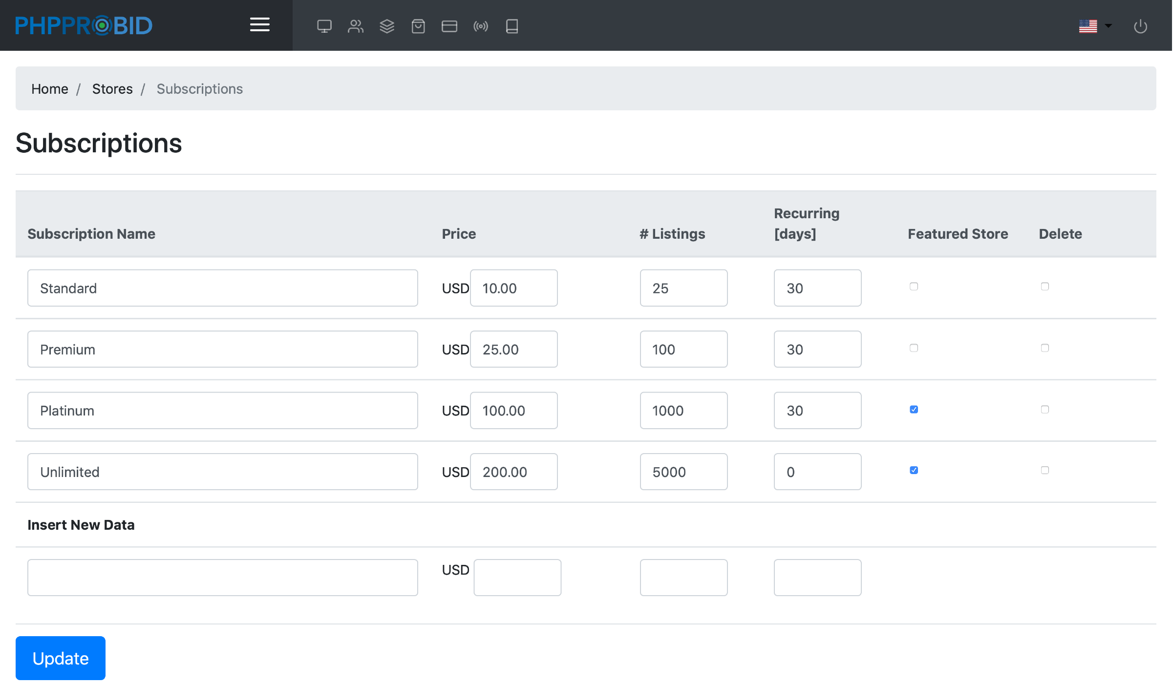 Subscriptions (Admin Control Panel -> Stores -> Subscriptions) allow clients to purchase listing services for a specific period of time for a set price. From the Subscriptions menu, complete the following: