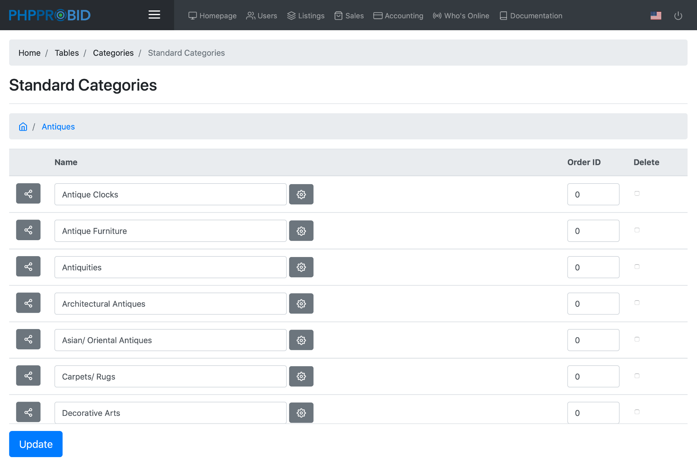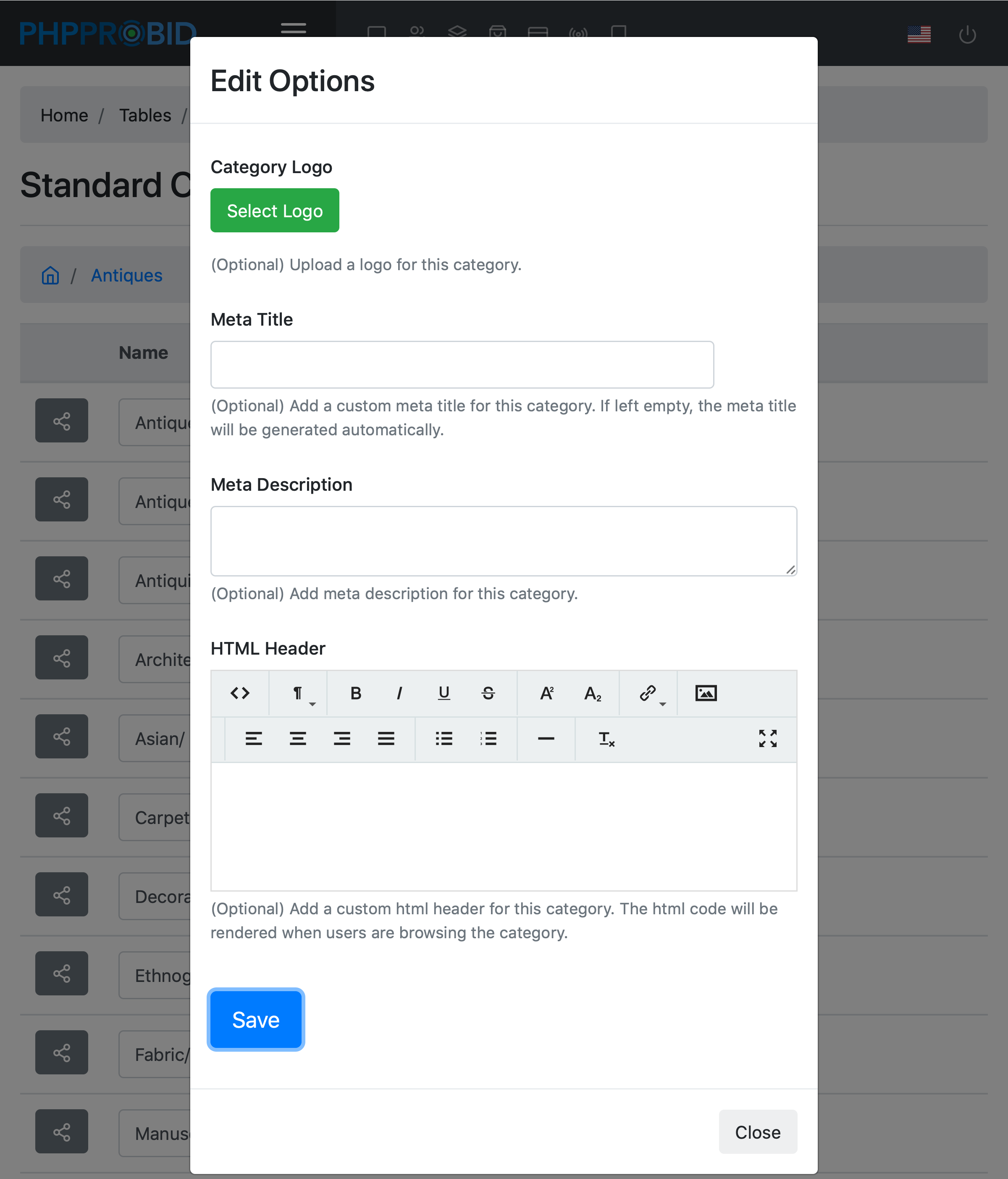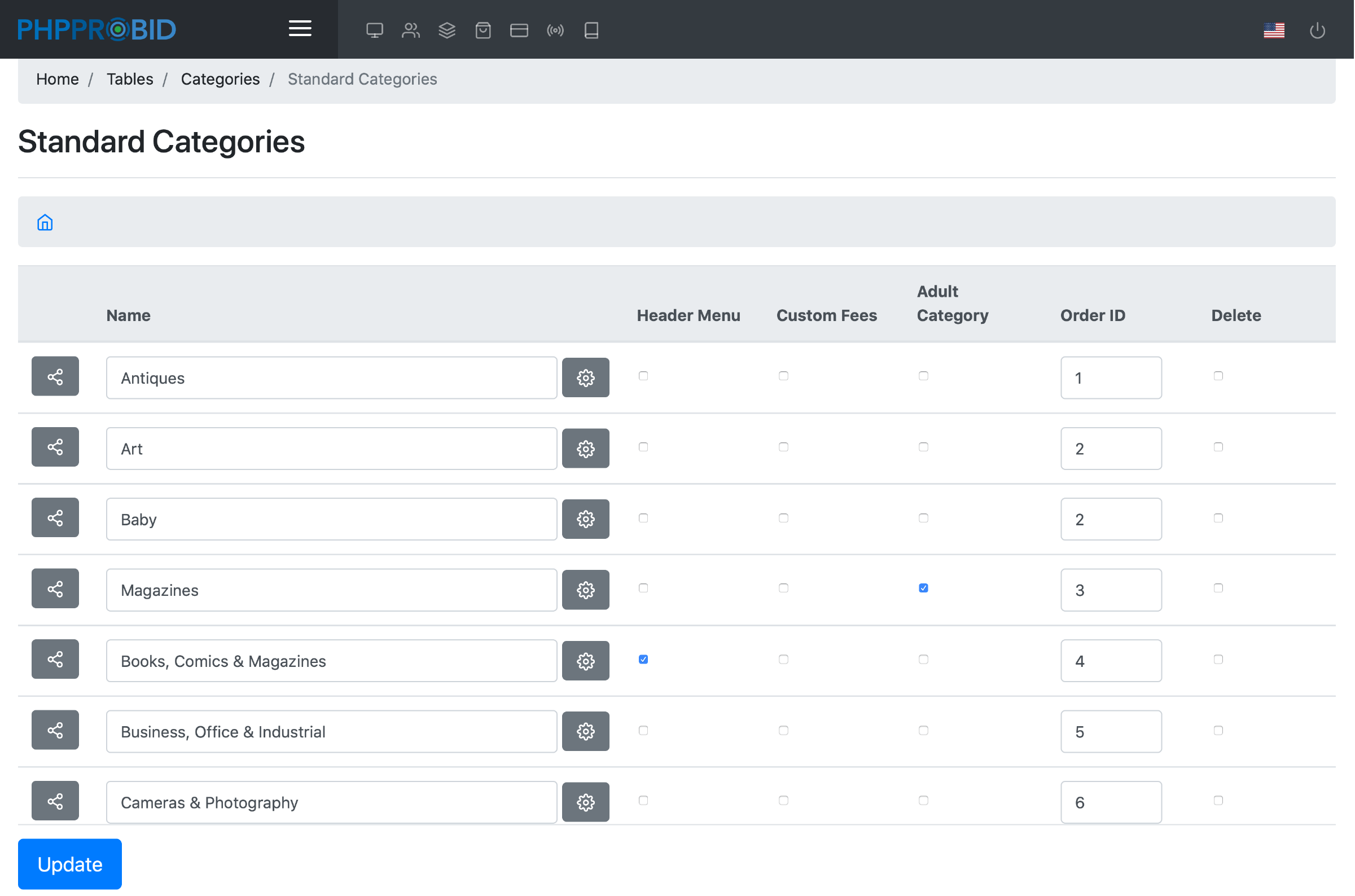 From the Categories (Admin Control Panel -> Tables) menu, users can add classes (elements) of objects relevant to their sites.