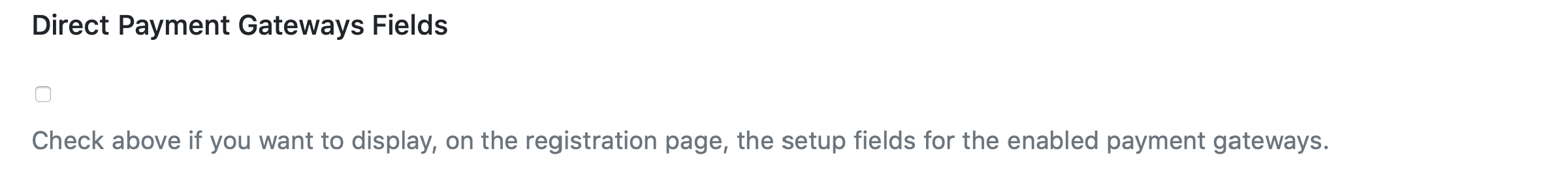 If enabled will display, on the registration page, the setup fields for the direct payment gateways.