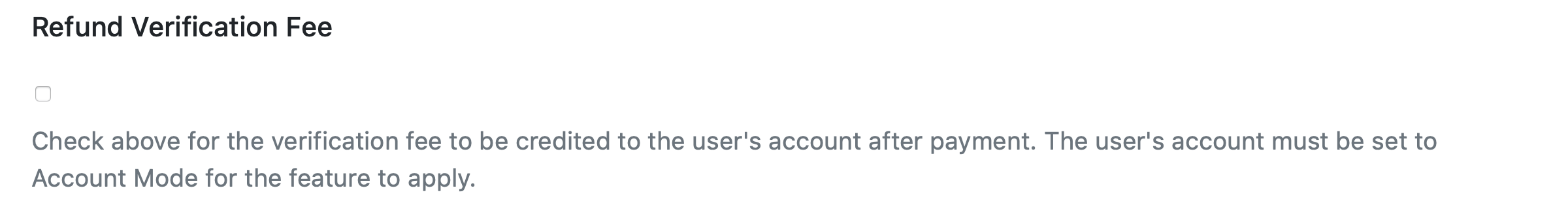 If enabled, the verification fee will be credited to the user's account after payment. The account must run in Account Mode for the payment to be credited.