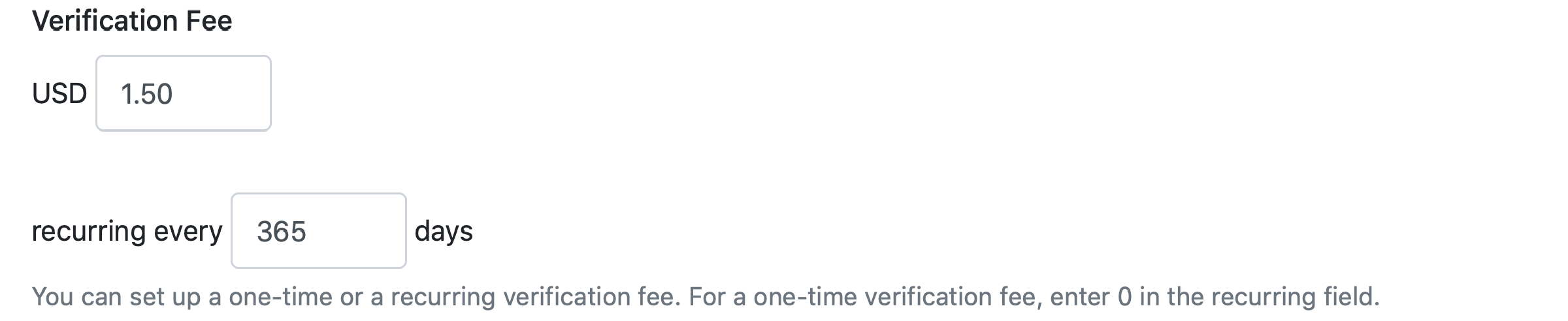 The admin sets a one time or recurring verification fee. To set up a one time verification fee, enter 0 in the 'recurring every...days' field.