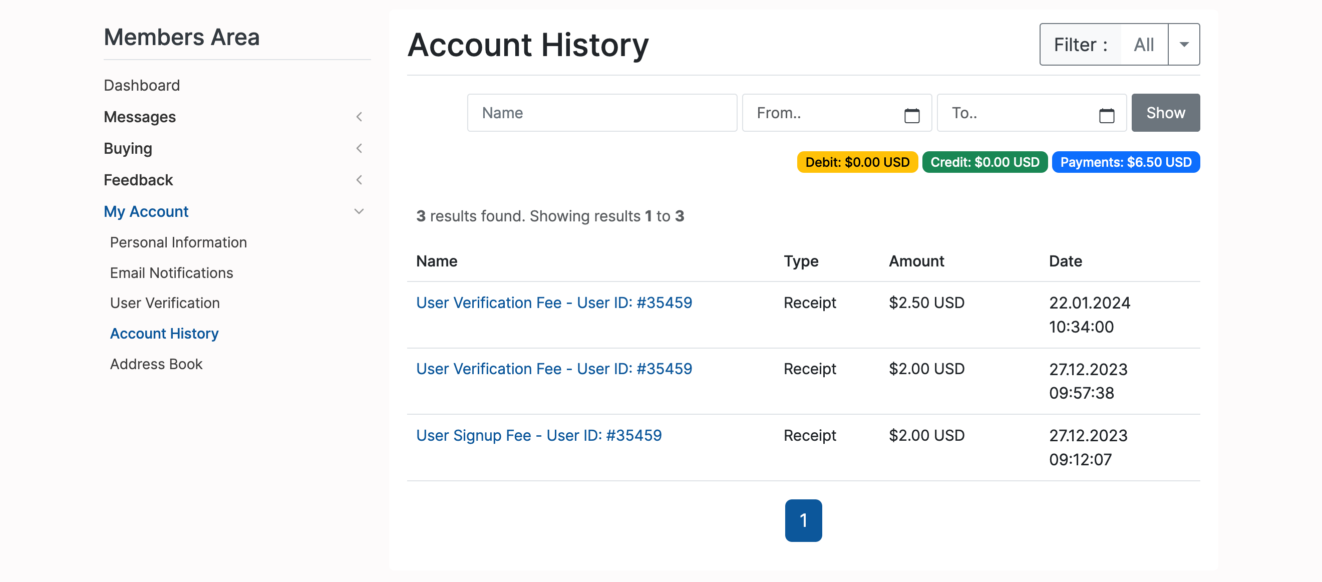 Review transactions history from the Account History menu (Home -> Members Area -> My Account -> Account History):