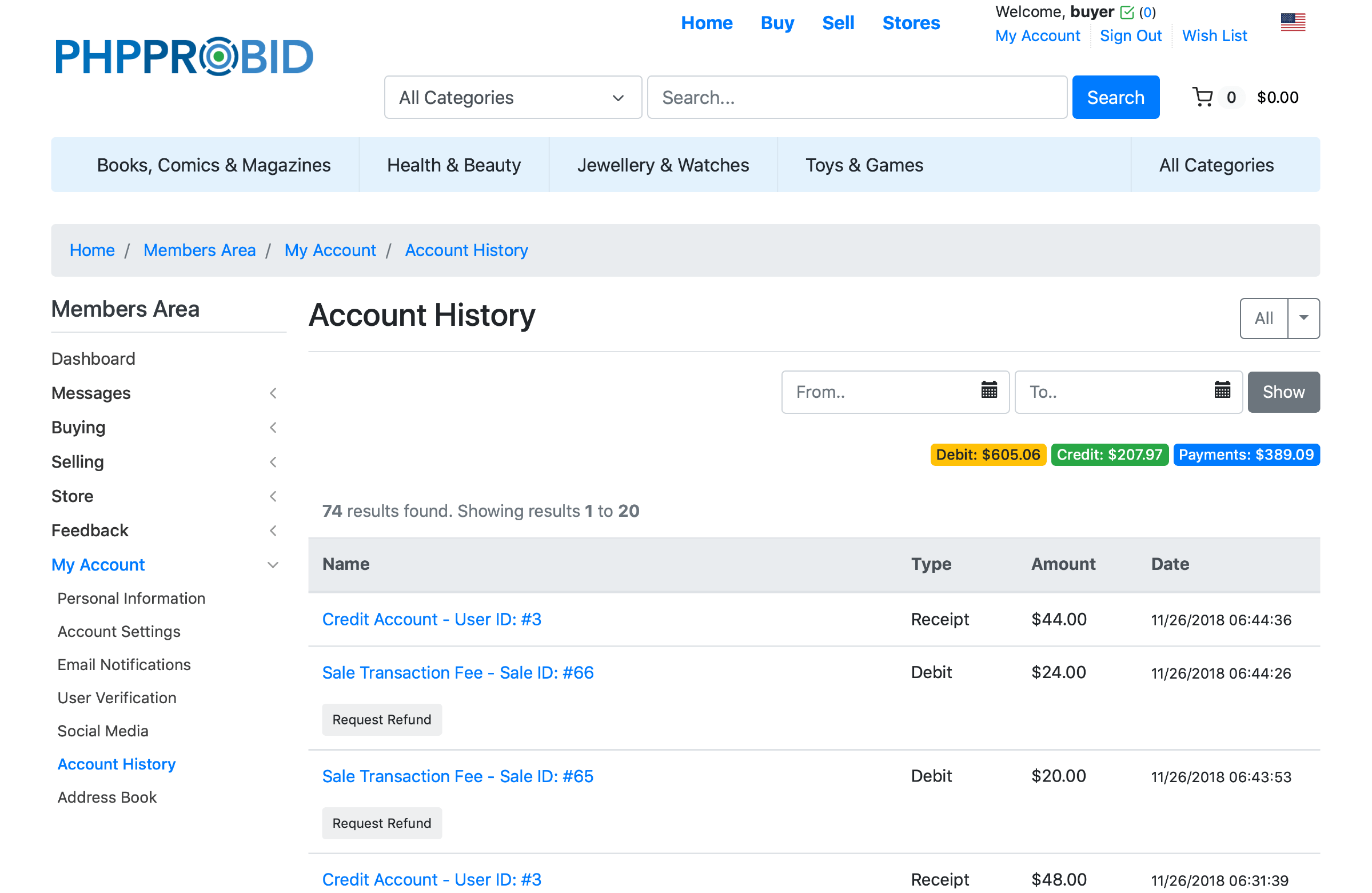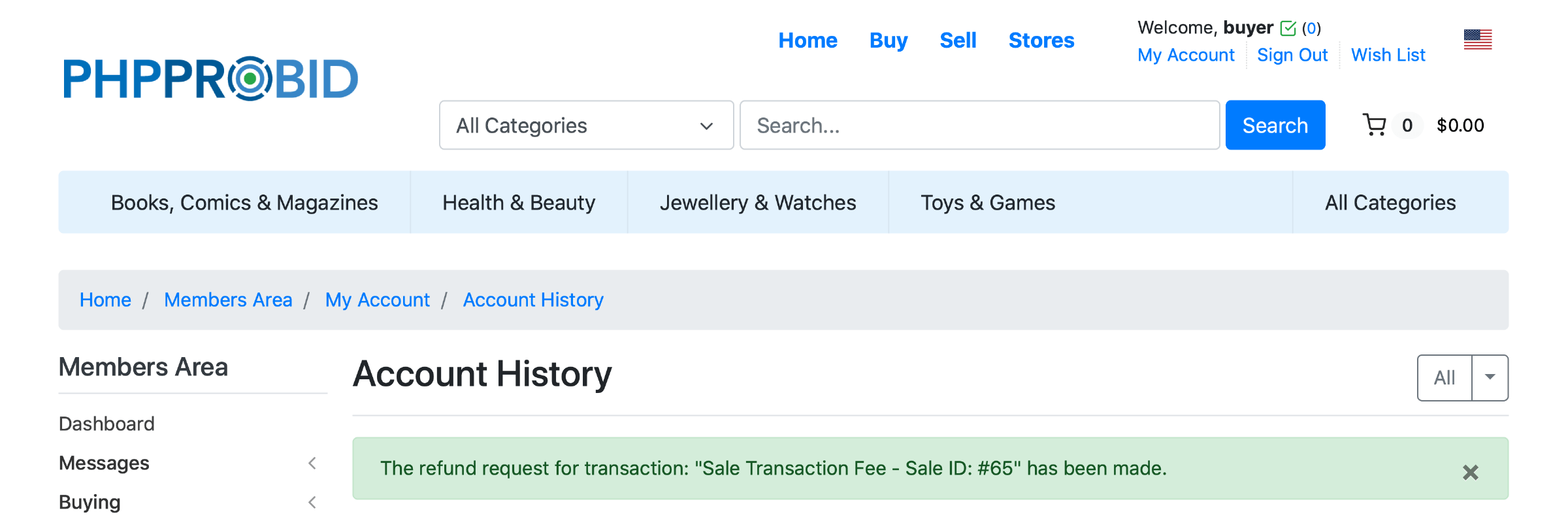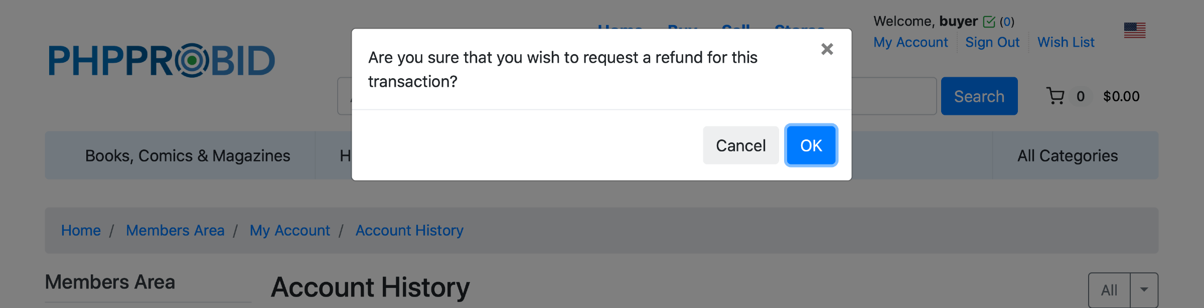 Claim a refund from the Account History section (Home -> Members Area -> My Account -> Account History):