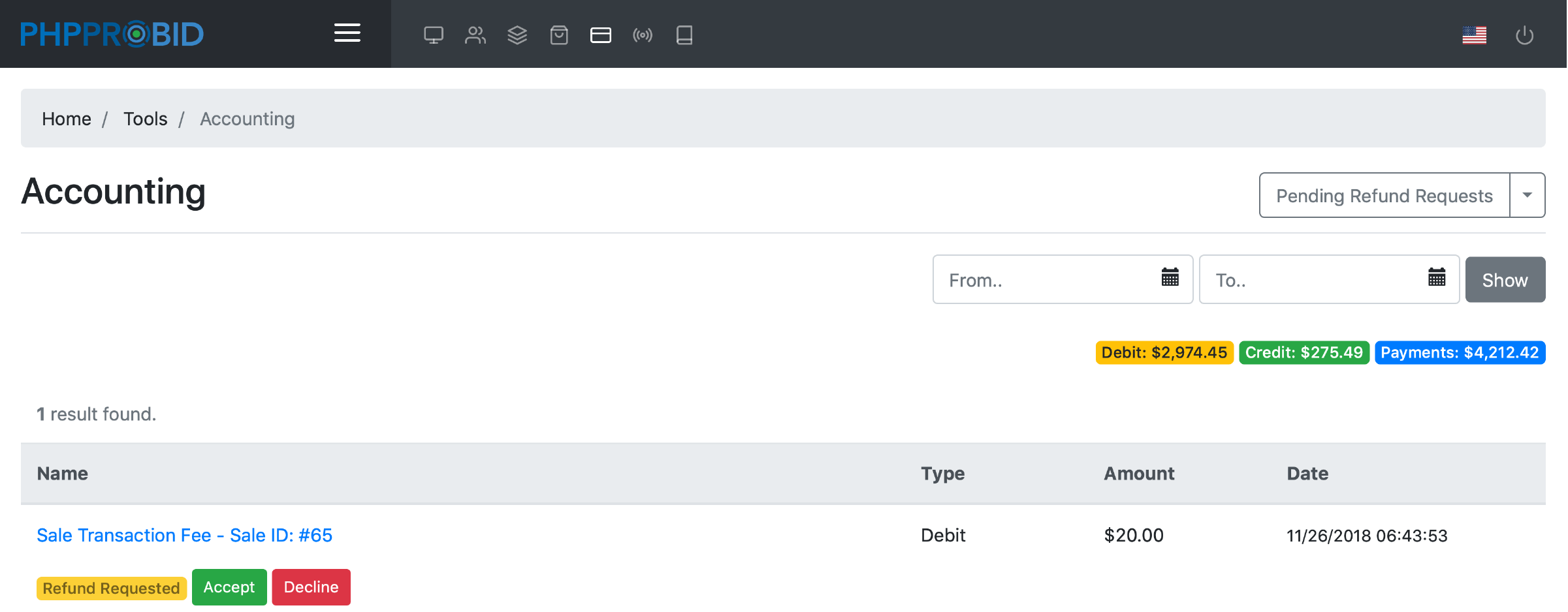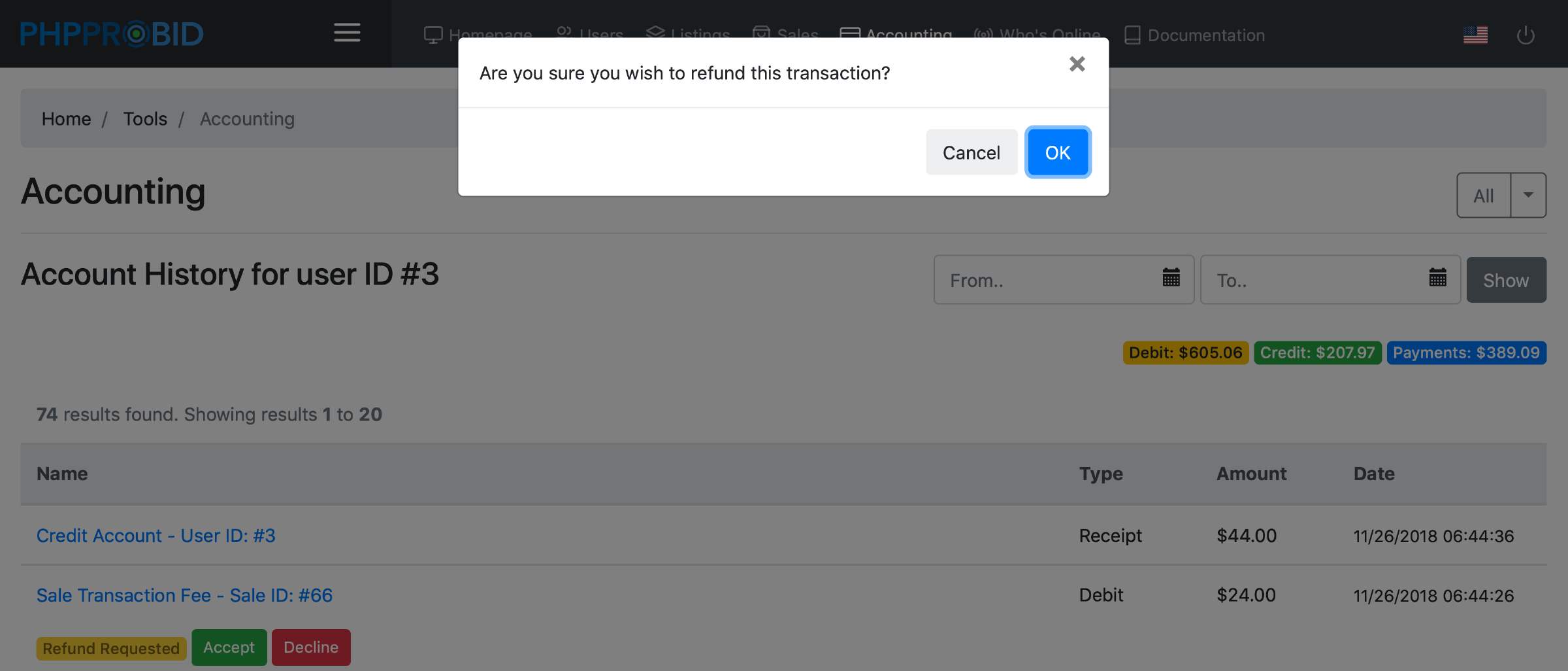 The admin, from the Accounting (Tools -> Accounting) menu, can accept or decline the request: