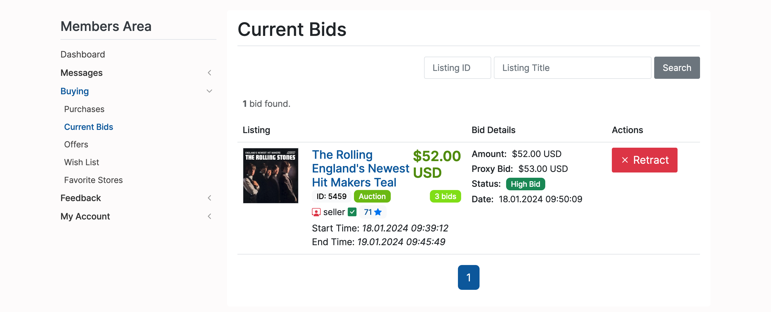 Important: Only the highest bidder will be allowed to retract his / her bid.