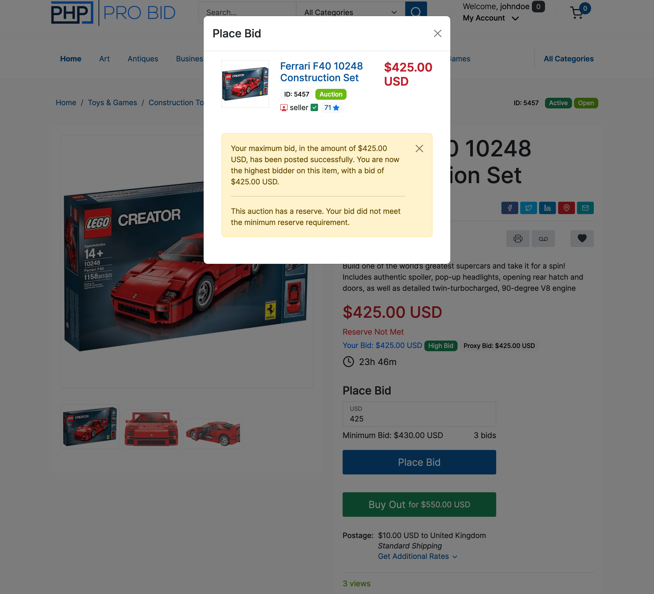 The next screen will display a message confirming the bid.