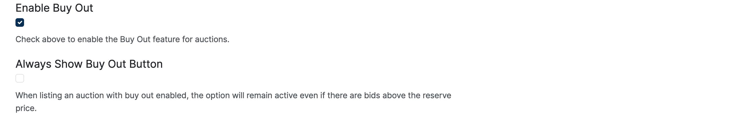 If enabled, together with Buy Out, the option will remain active even with bids above the reserve price.