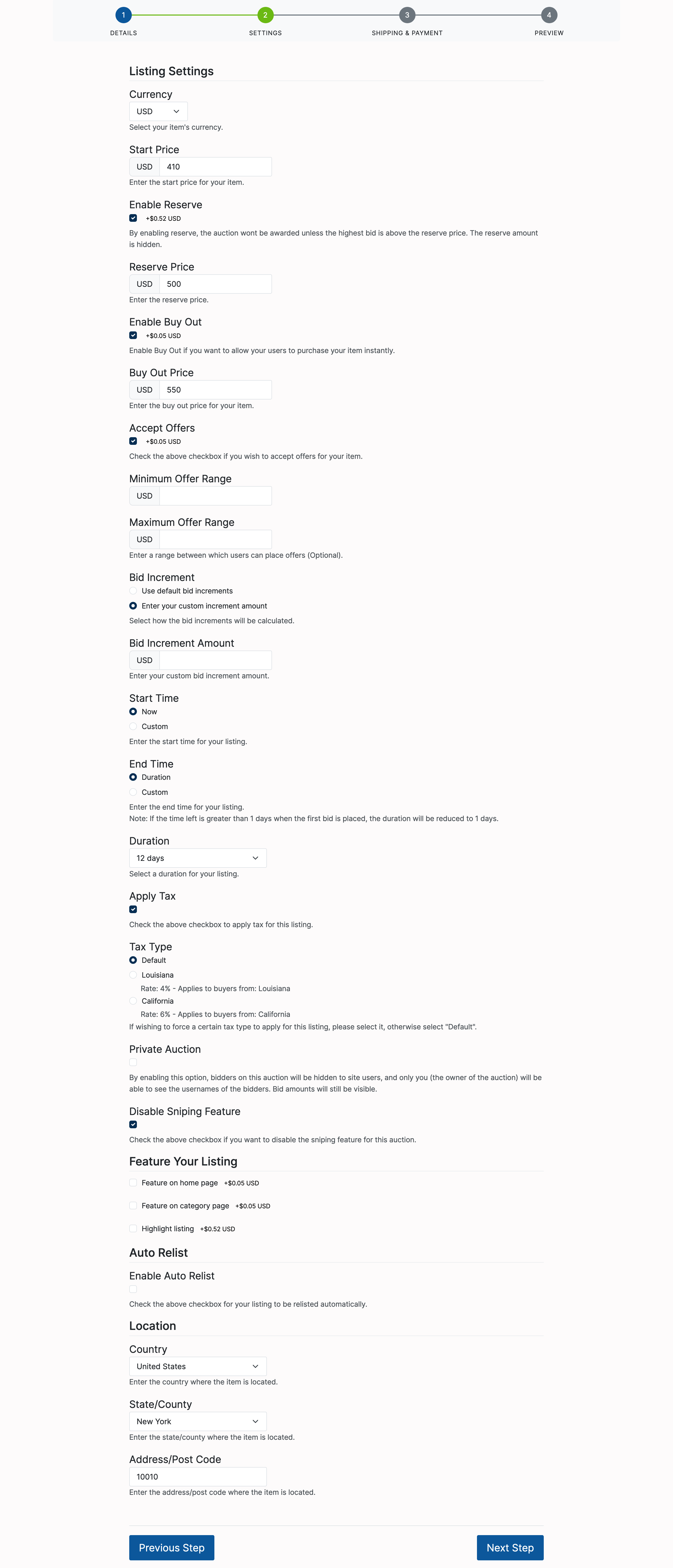 In the Listing Settings section, complete the distinct auction type fields: