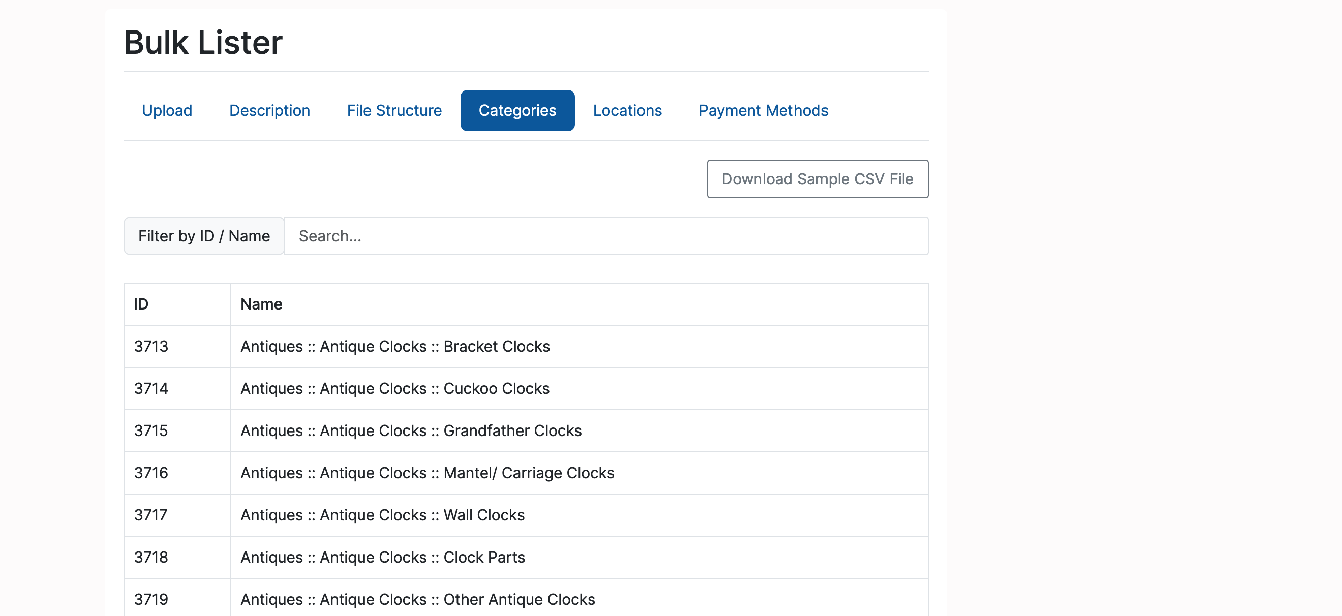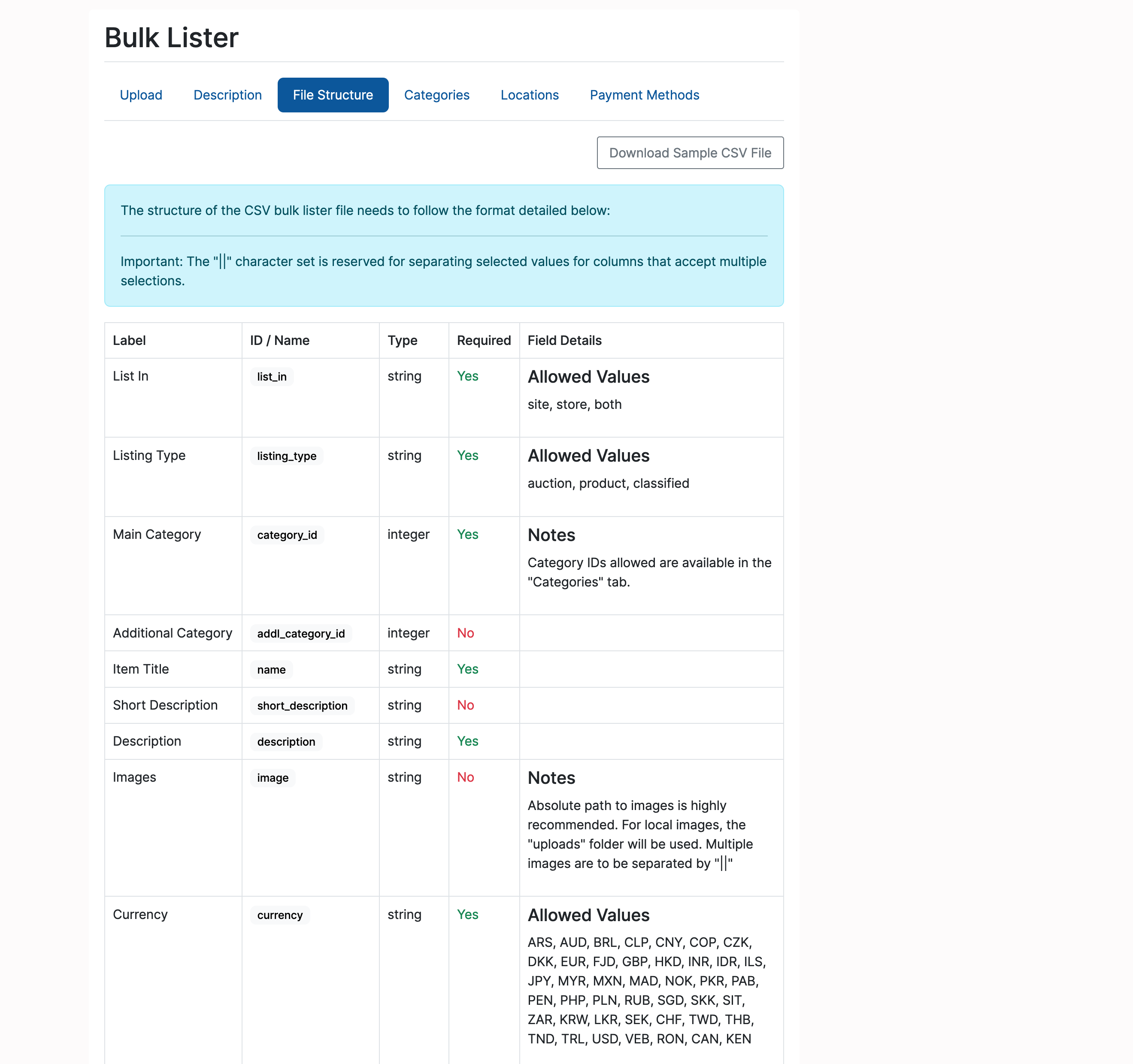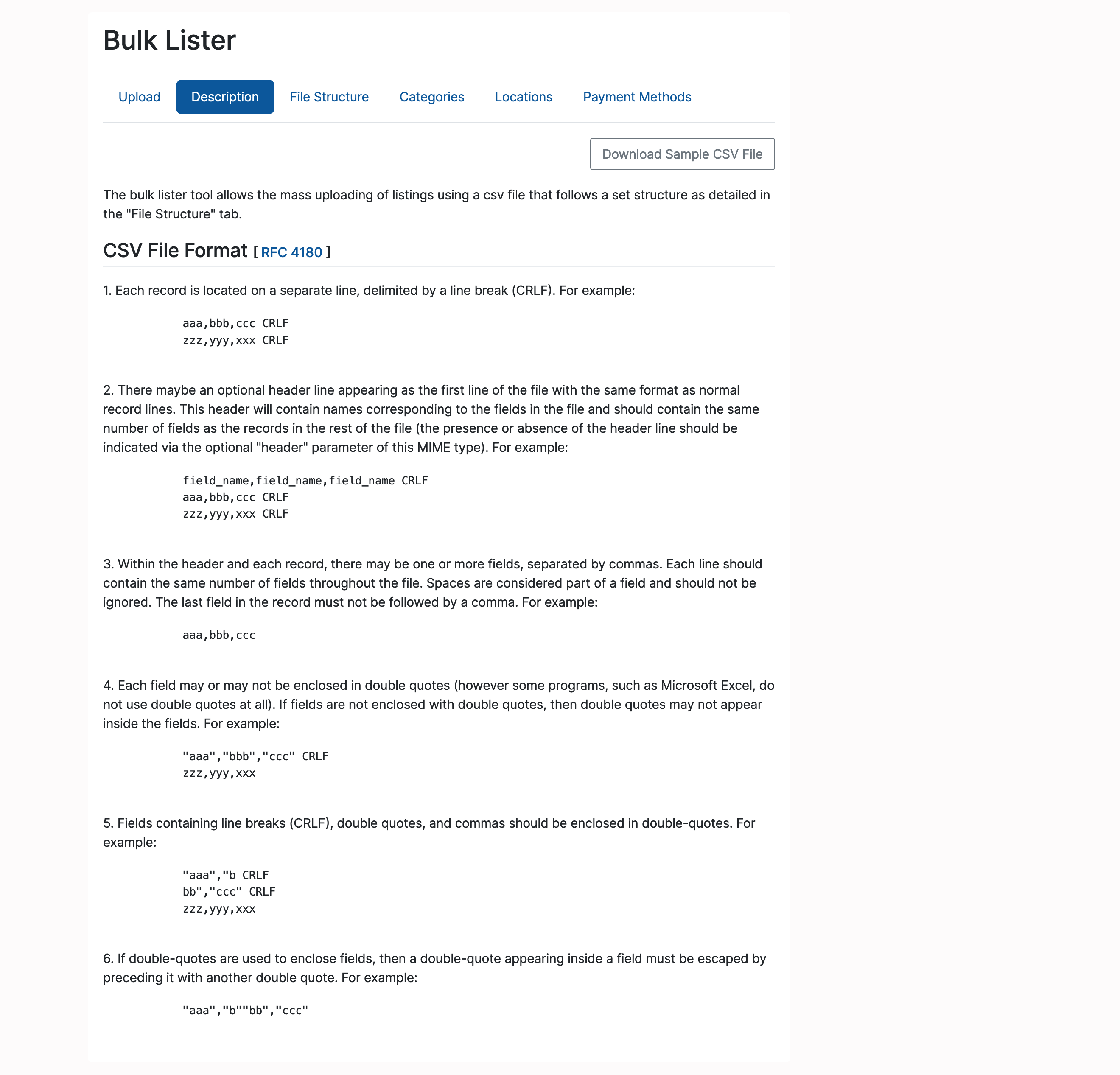 The Bulk Lister tool allows the mass uploading of listings using a cvs file that follows a set structure.