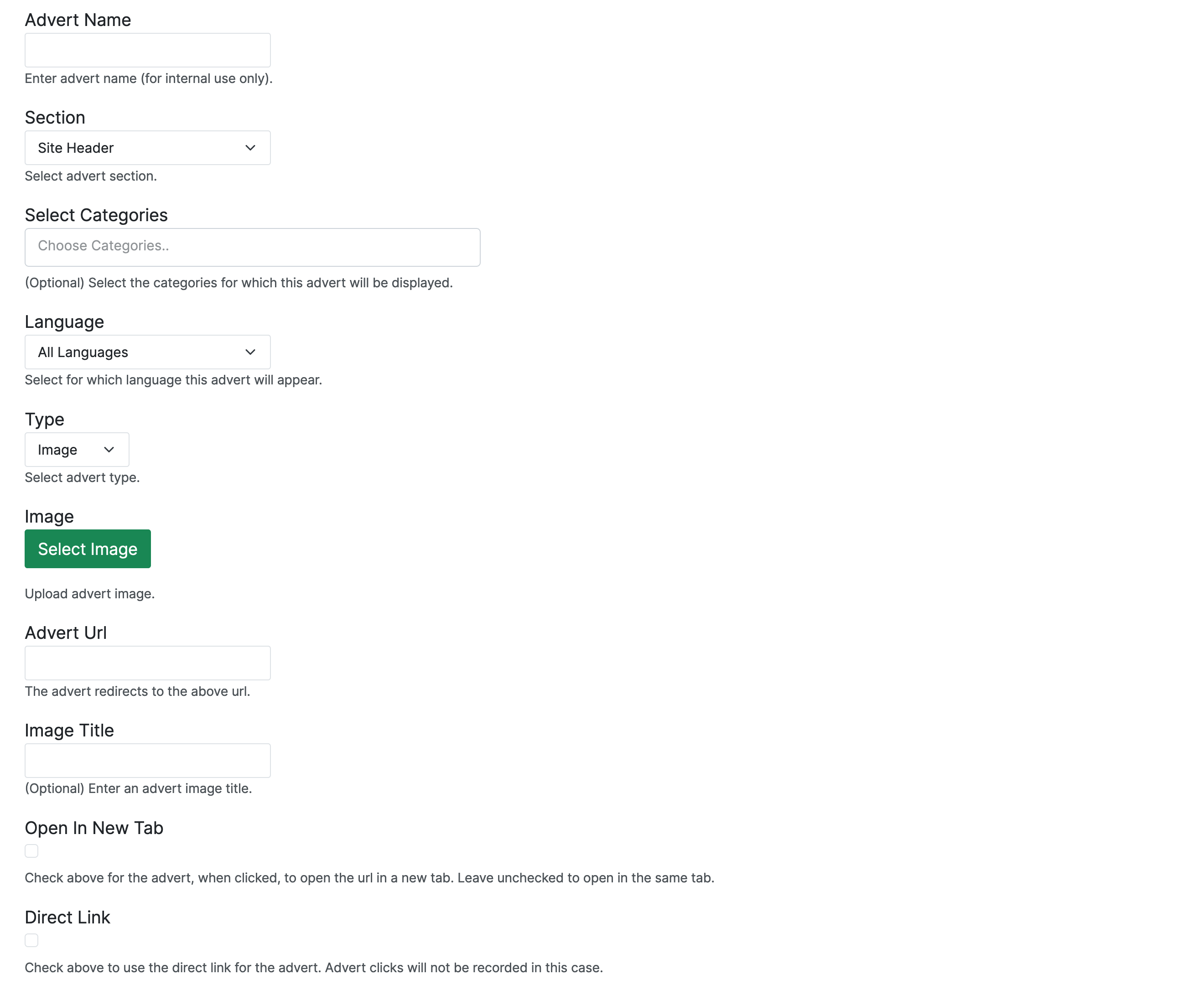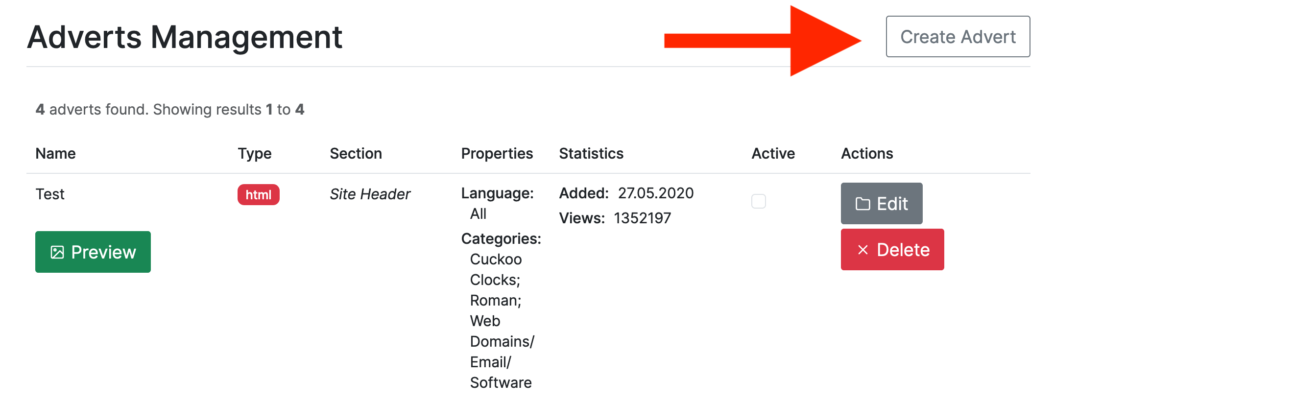 From the Adverts Management menu (Admin Interface -> Site Content -> Adverts Management) users can create and display adverts in their stores. Click on the Create Advert to create your ad.