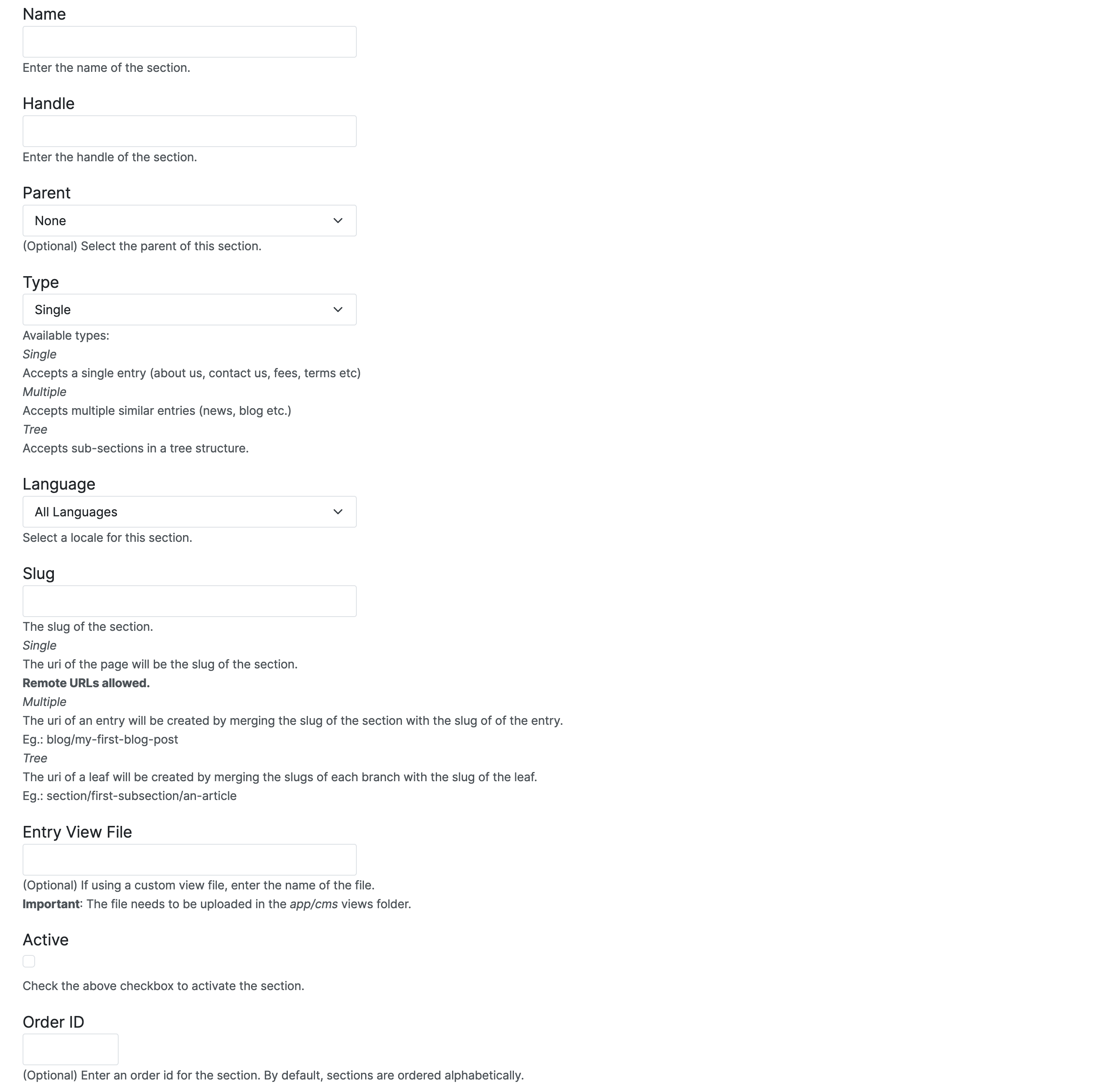 Single sections accept only one entry. Used mostly for single pages such as Contact, Terms and Conditions, etc.