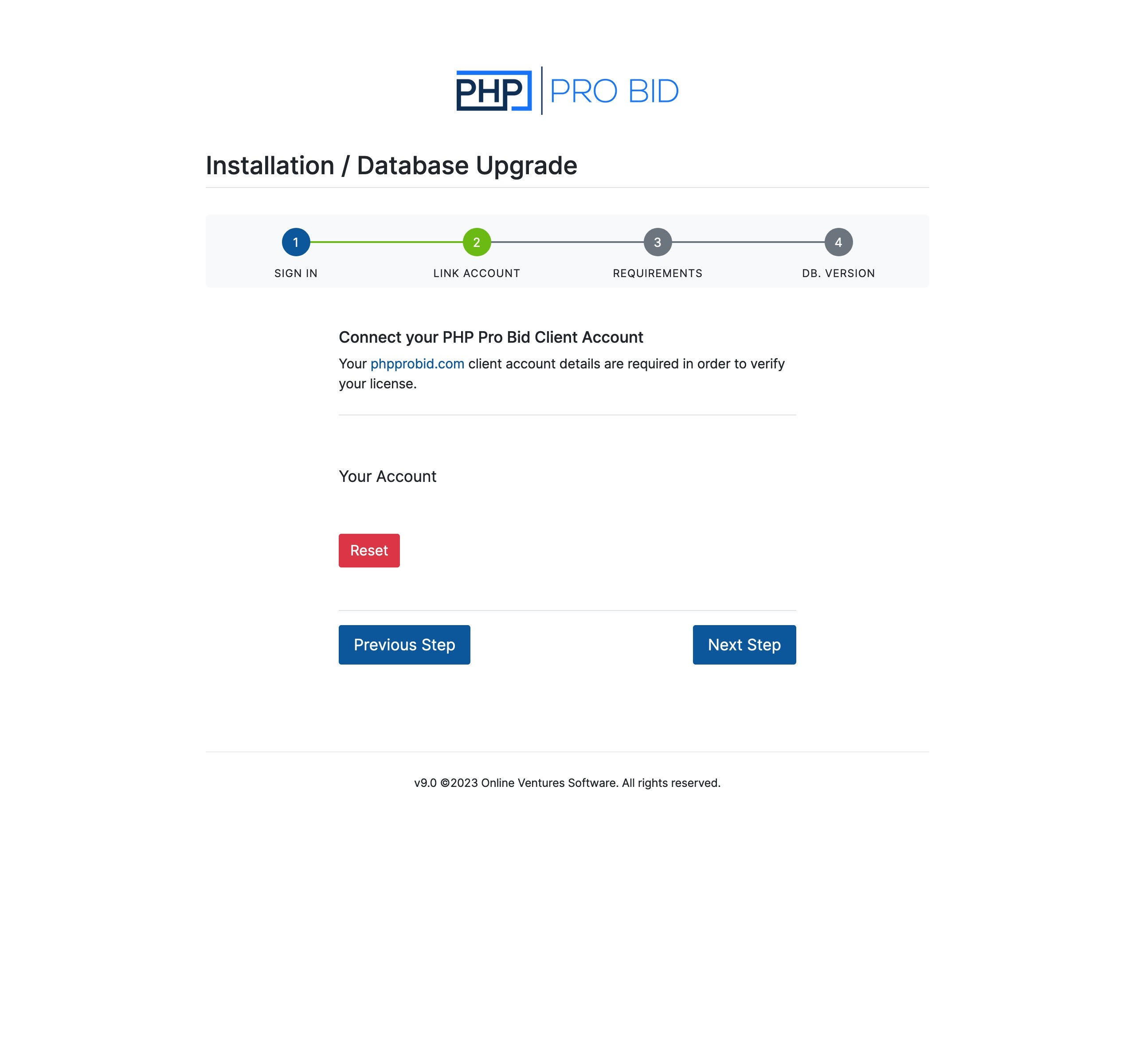 Next, connect your PHP Pro Bid account, to verify your existing license.