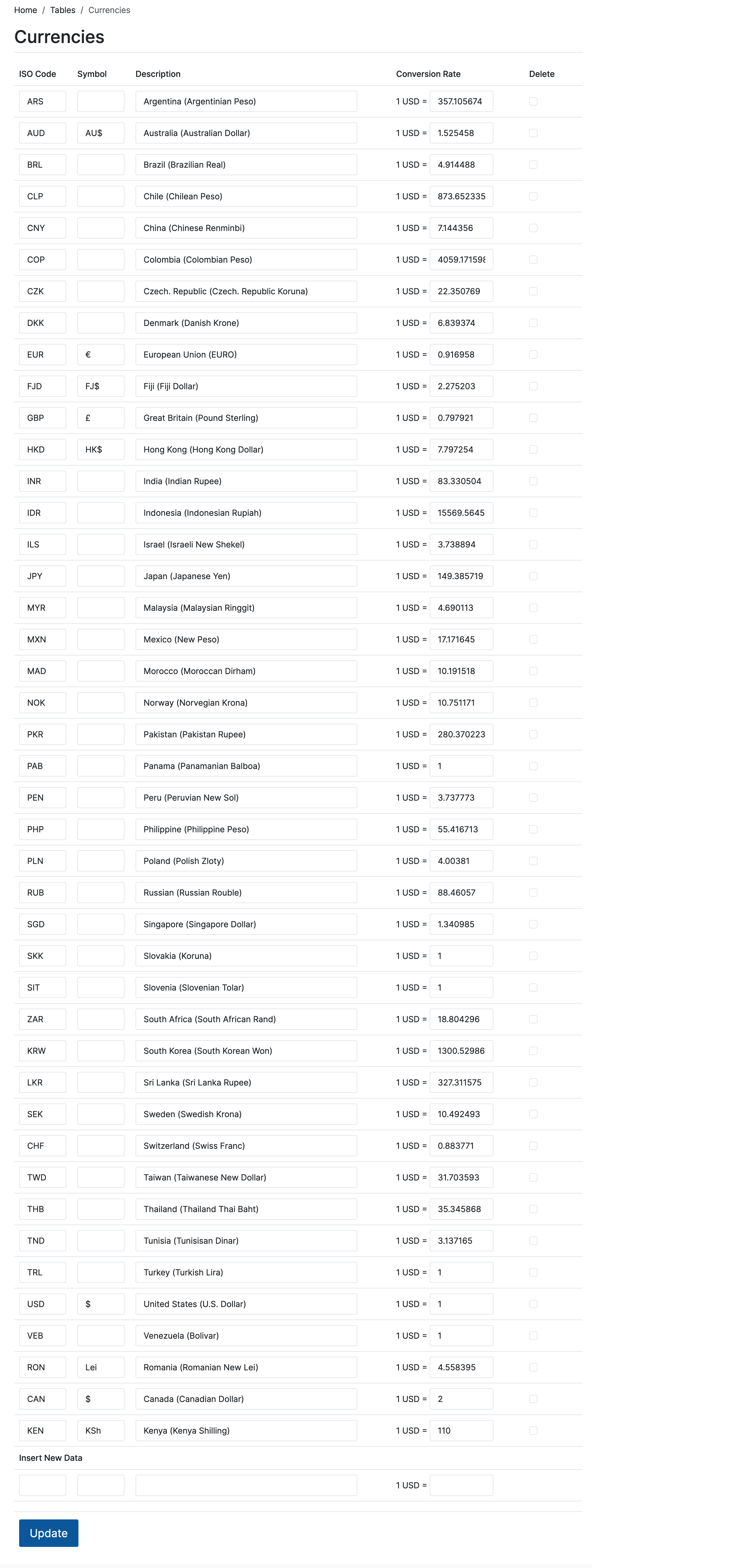 Note: To define available (or delete) currencies go to Tables -> Currencies.