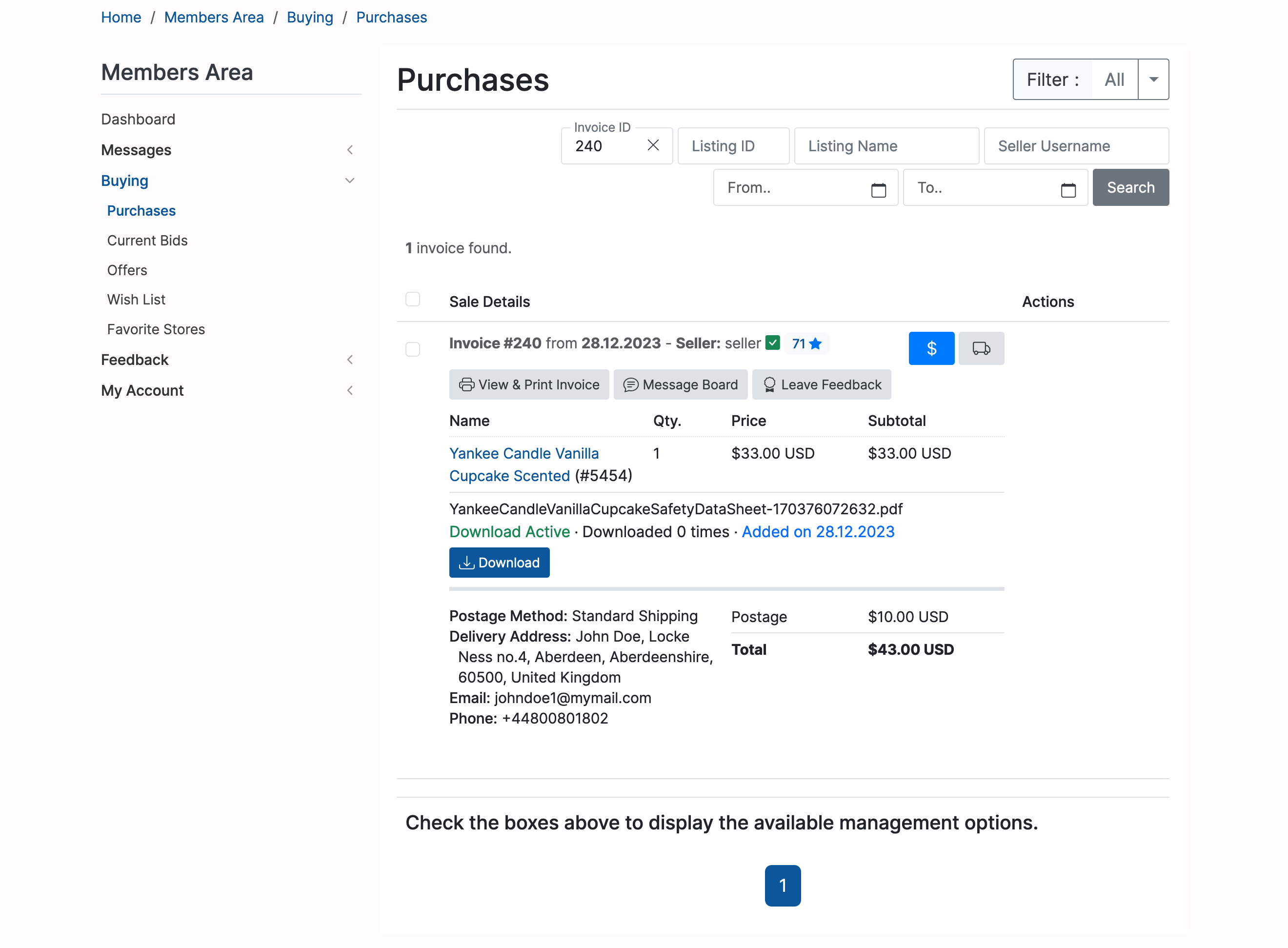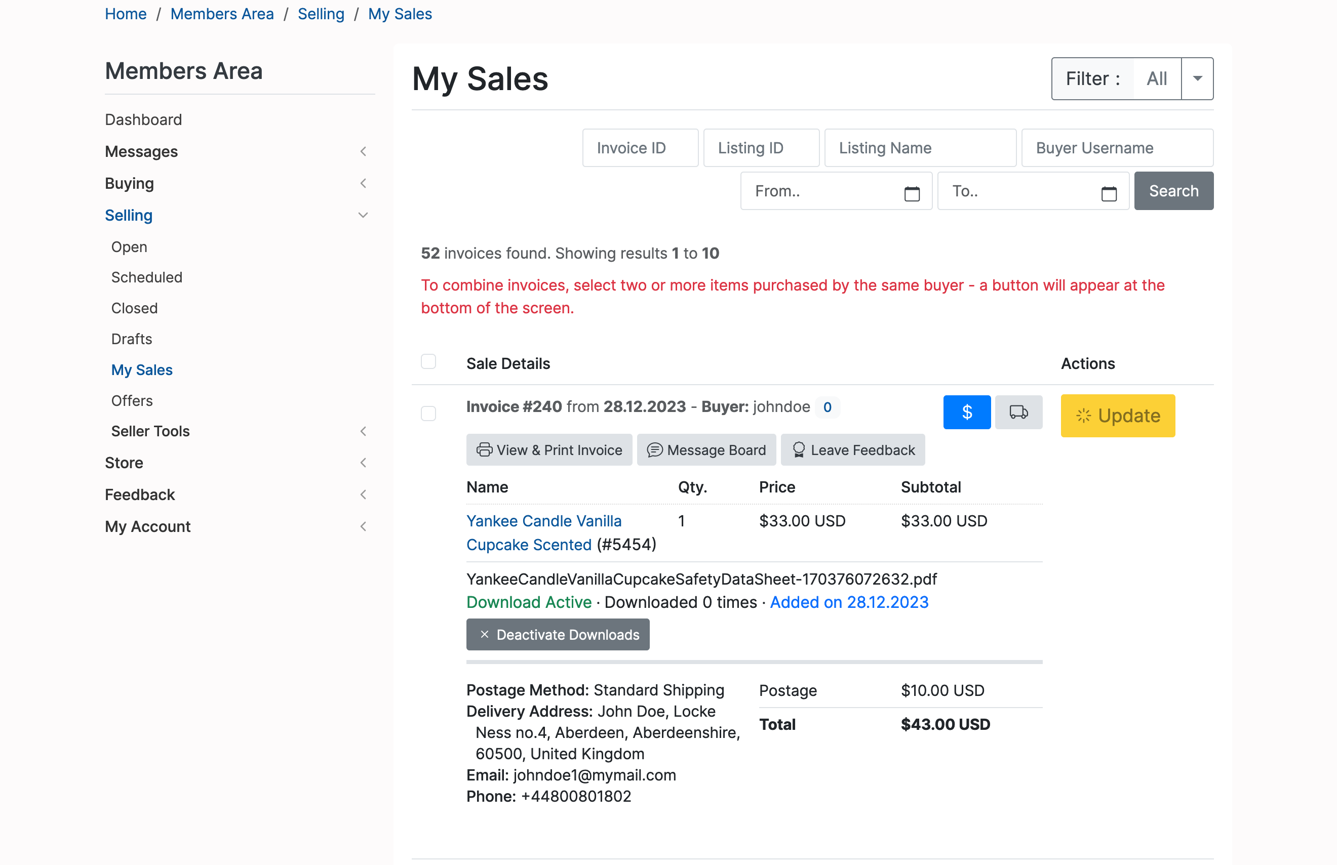 After selling an item, the seller can, from the My Sales (Home -> Members Area -> Selling ->My Sales ) section: