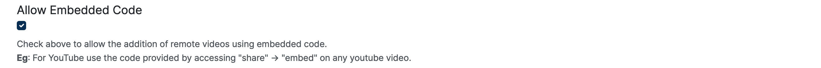 If checked, allows the upload of videos using an embedded code.