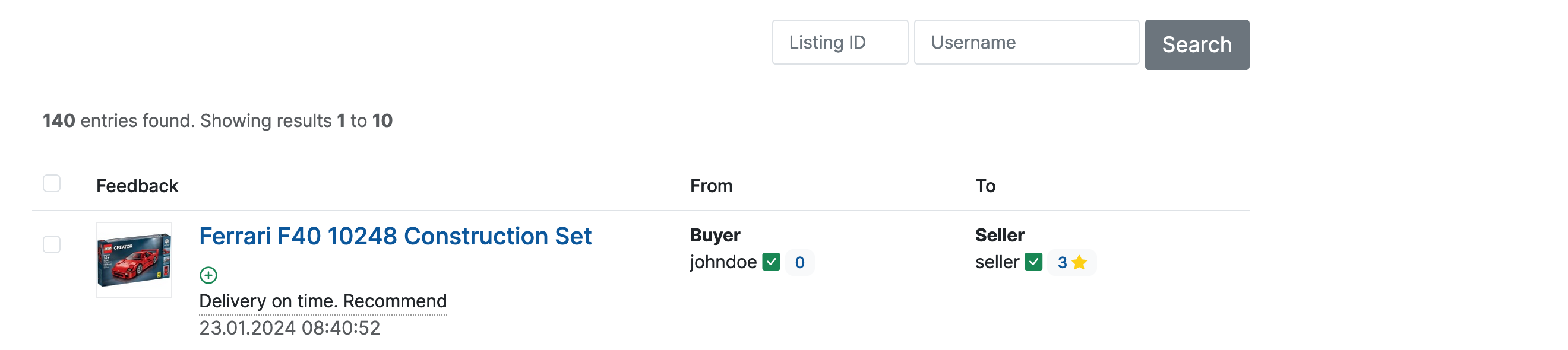 Search for posted feedback by Listing ID or Username and review (and delete if desired) all posted feedback: