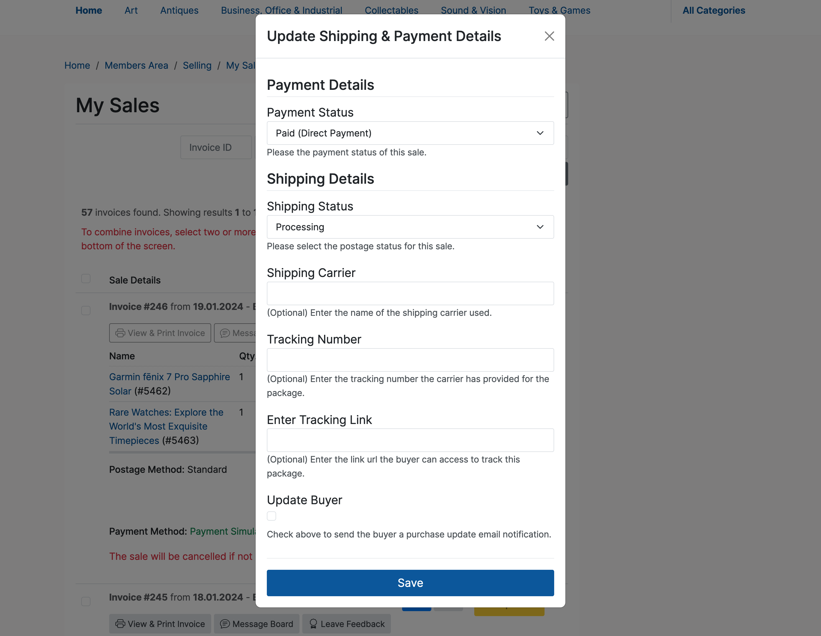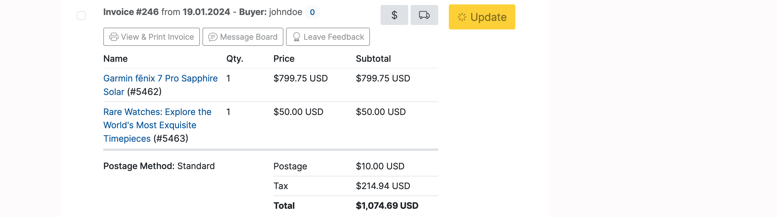 Select an invoice from My Sales (Home -> Member Areas -> Selling -> My Sales) and open the Update menu: