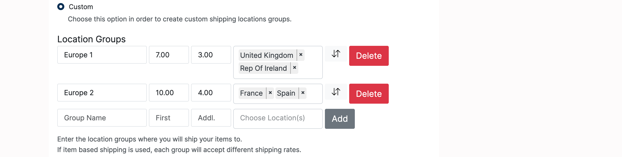 Two location groups Europe1 (United Kingdom, Ireland) and Europe2 (France, Spain) with two different shipping rates.