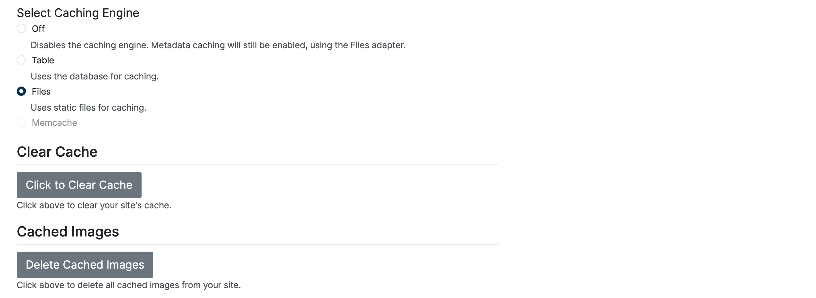 The caching plugin, exclusively designed for routes and queries, comes with three possible options. From the Caching menu (Settings -> Site Settings -> Caching), admins can use the Caching Engine to do the following: