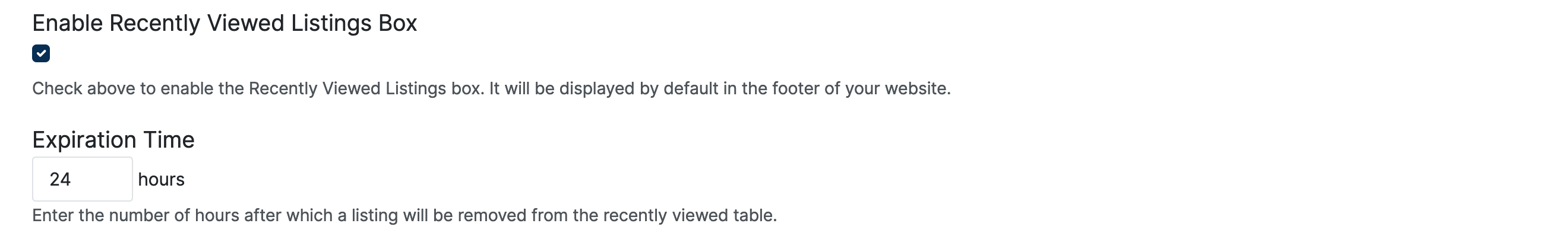 If checked, enables the recently viewed listings box, which will be displayed (by default) in the footer of the website.
